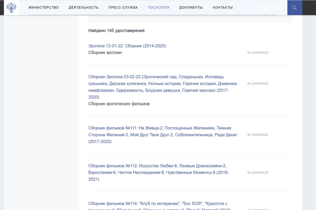 Можно предположить, что российские власти готовят к запуску платформы, где могли бы выходить заранее согласованные с ними фильмы для взрослых. Как минимум с 2023-го онлайн-кинотеатры, в том числе государственные «Премьер», Wink и «Море», транслируют эротику и легкую порнографию. В таких картинах нет акцента на гениталиях, оргазме и прочих слишком откровенных кадров — как когда-то было по ночам на телеканале «РЕН ТВ». В конце 2024-го журналисты «Север.Реалии» нашли как минимум 145 прокатных удостоверений, выданных Минкультом РФ, для показа эротических картин в онлайн-кинотеатрах. Однако, поскольку даже подобная легкая форма порнографии подпадает под статью 242 УК РФ, а российские стриминги занимаются ее прямым распространением, юридический вопрос остается открытым.