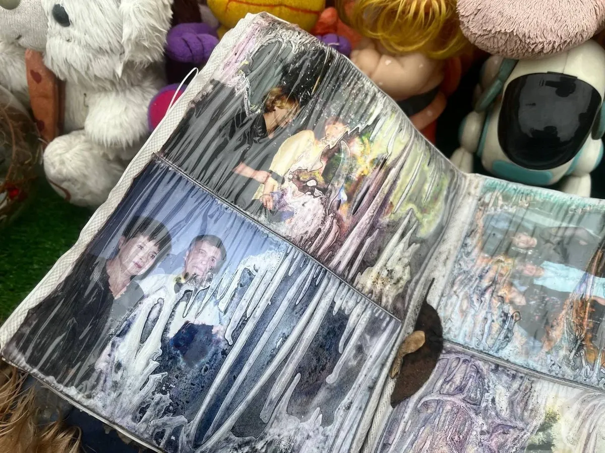Игрушки не убирали даже зимой. Некоторые из них грязные. Среди плюшевых зверей, в рамке, стоит выцветший портрет пожилого мужчины с черной лентой. Рядом — деревянная икона Божией Матери и альбом. На фотографиях — улыбающиеся люди за семейными застольями. Но с каждой страницей лица все сильнее расплываются: от дождей и сырости изображения превратились в цветные пятна — и люди исчезли даже в памятных фотографиях.