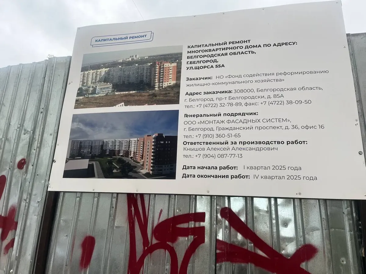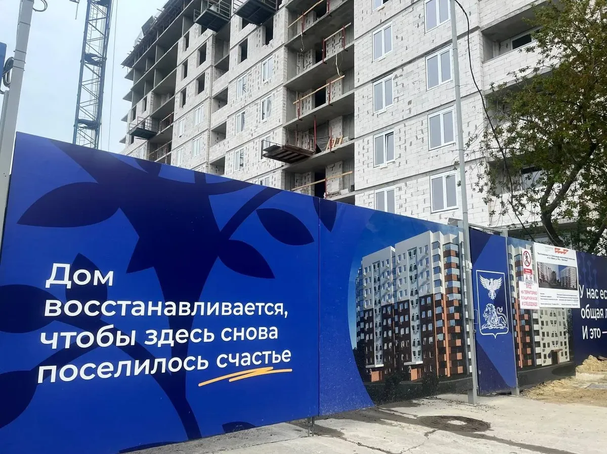 Рядом с баннером — изображение будущего дома с бело-бордовым фасадом. Пока подъезды сильно отличаются от изображения на картинке: серые стены, незастекленные окна, верхние этажи еще достраивают. Жителей должны заселить сюда к декабрю 2025 года. Забор закрыт, и пройти в дом могут только собственники жилья в пострадавших подъездах.