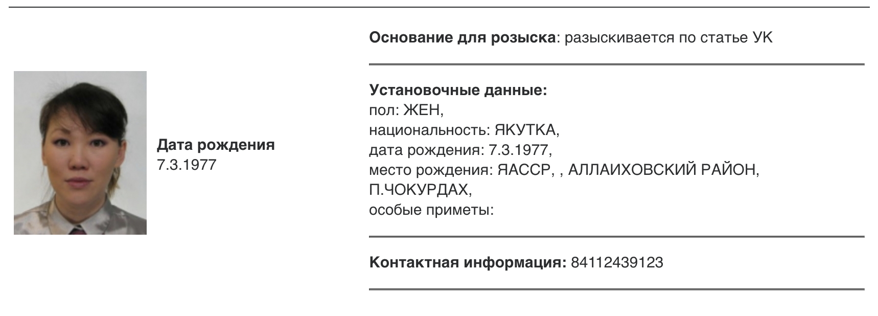Скриншот из базы розыска МВД