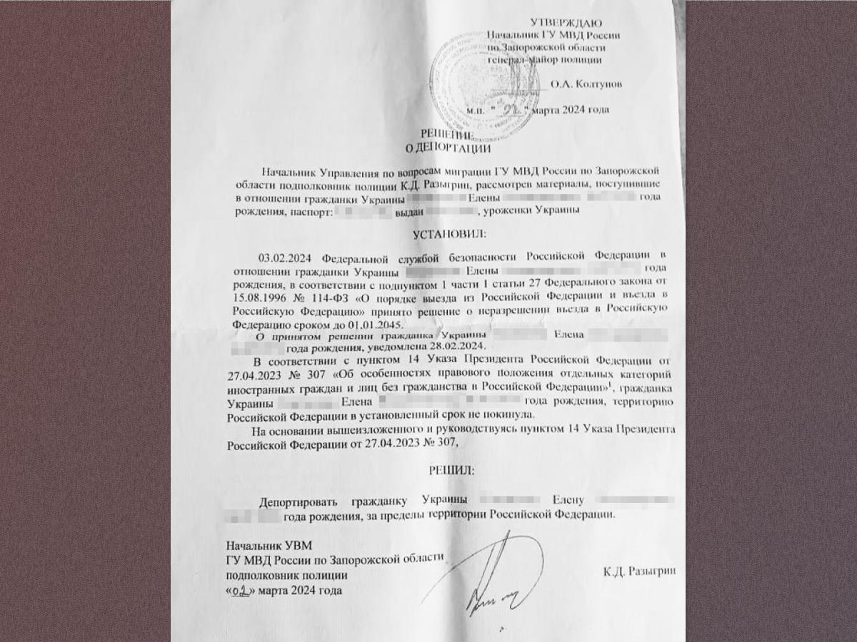 В марте 2024 года 50-летнюю Елену привезли на границу Грузии и России в Верхнем Ларсе. Путь из Мелитополя в Запорожской области Украины на машине занял почти сутки. Ее вместе с еще одной депортированной женщиной охраняли три сотрудника МВД. На границе Елене выдали ее документы, которые забрали во время обыска полгода назад, и решение о депортации. Решение подписал руководитель Управления по вопросам миграции ГУ МВД России в Запорожской области Константин Разыгрин. В нем сказано, что ФСБ запретило ей, гражданке Украины, въезд в Российскую Федерацию до 2045 года.