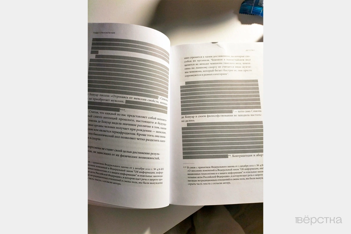 Сегодня издательства изобретают всё новые способы «подстелить соломку» под малопонятный, но качественно пугающий штрафами и тюрьмой закон о пропаганде ЛГБТ. Например, в переводных книгах часть текста они просто закрашивают чёрными полосками. Так поступило издательство АСТ, отцензурировав биографию известного итальянского режиссера Пьера Паоло Пазолини, который был открытым гомосексуалом. Из книги практически полностью пропала тема сексуальности и личной жизни героя, а в издательстве заявили, что это более честный выбор, чем просто вырезать абзацы, будто их в книге и не было. Другое российское издательство «Альпина нон-фикшн» выпустило книгу о философии французской писательницы-феминистки Симоны де Бовуар с чёрными полосами вместо некоторых цитат.