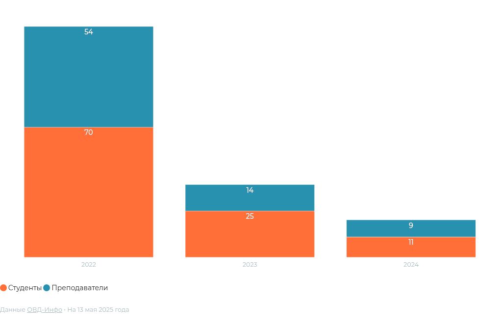 Впоследствии число политически мотивированных уголовных против россиян, в частности, студентов и преподавателей, также снижалось: количество случаев политических преследований студентов и преподавателей в 2024 году достигло 35, в то время как в 2022-2023-х зафиксировано по 63 случая. Вероятно, это может быть связано с ужесточением законодательства и страхом публичных высказываний на фоне суровых приговоров по «антивоенным» делам. Кроме того, на снижение числа политических преследований в университетах могла повлиять массовая эмиграция среди преподавателей и ученых.