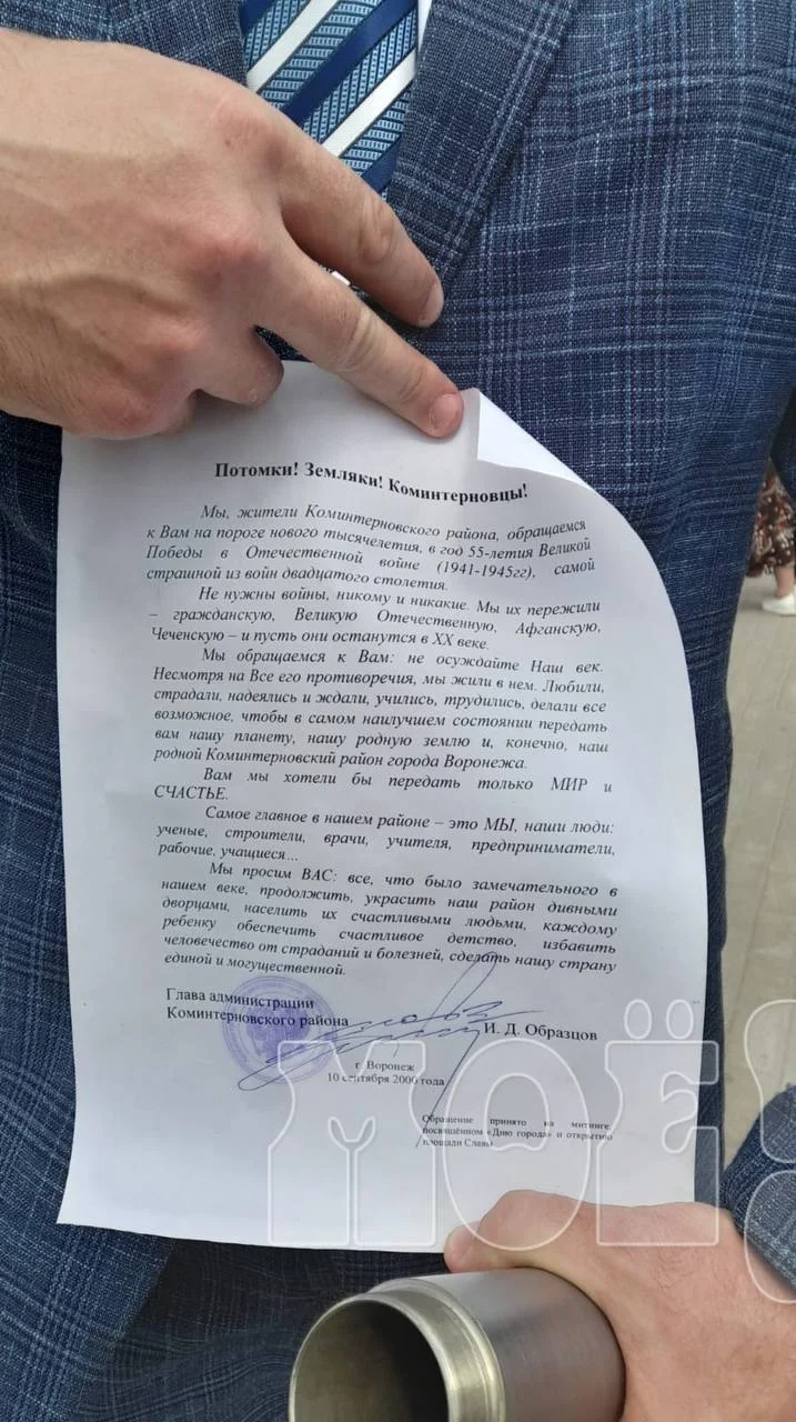 Мэр Воронежа Сергей Петрин процитировал послание потомкам из капсулы времени 25-летней давности, не упомянув антивоенные слова. Внимание на это обратил урбанист Юрий Родионов.