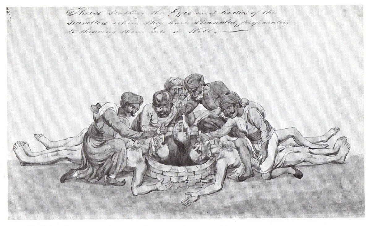 «У них был любимый трюк, чтобы обманывать доверчивых путников. Они посылали навстречу каравану или группе путешественников молодых женщин, которые горько плакали и причитали, вызывая жалость. После чего завлекали их в ловушку, где туги душили своих жертв шелковыми желтыми лентами, к которым с одного конца привязывалась монета достоинством в одну рупию. С утяжелением на одном конце было легче захлестнуть петлю на шее».