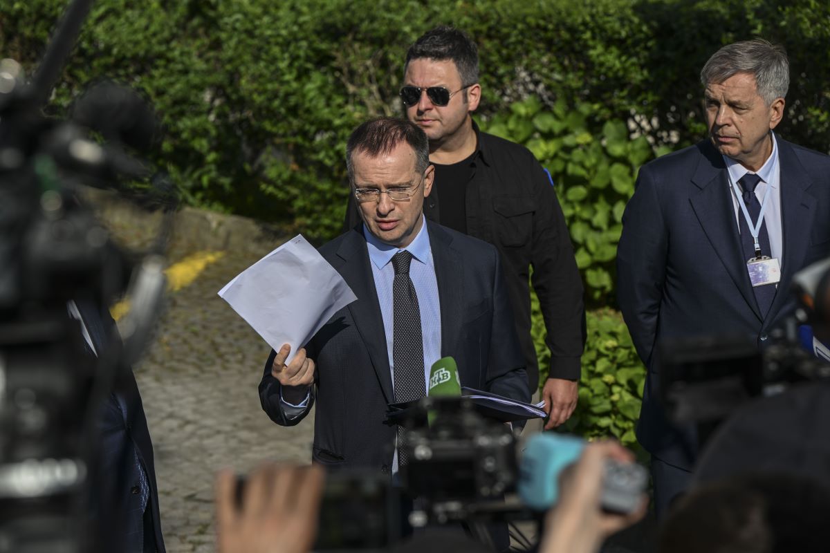 Фото: Помощник президента России Владимир Мединский прибывает в пресс-зону во дворце Чыраган, чтобы сделать заявление по итогам второго раунда мирных переговоров между Россией и Украиной в Стамбуле, Турция, 2 июня 2025 года. Anadolu via Reuters Connect