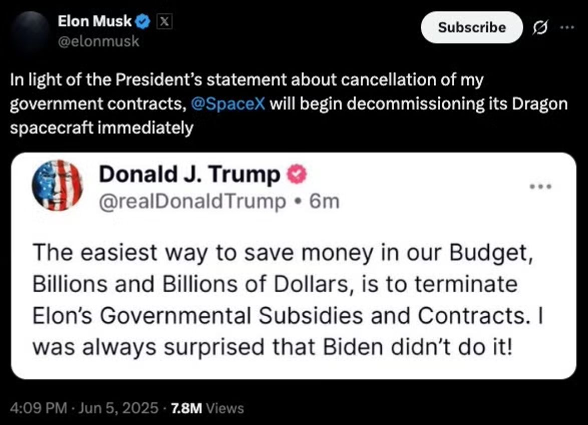 “In light of the President’s statement about cancellation of my government contracts, SpaceX will begin decommissioning its Dragon spacecraft immediately.”