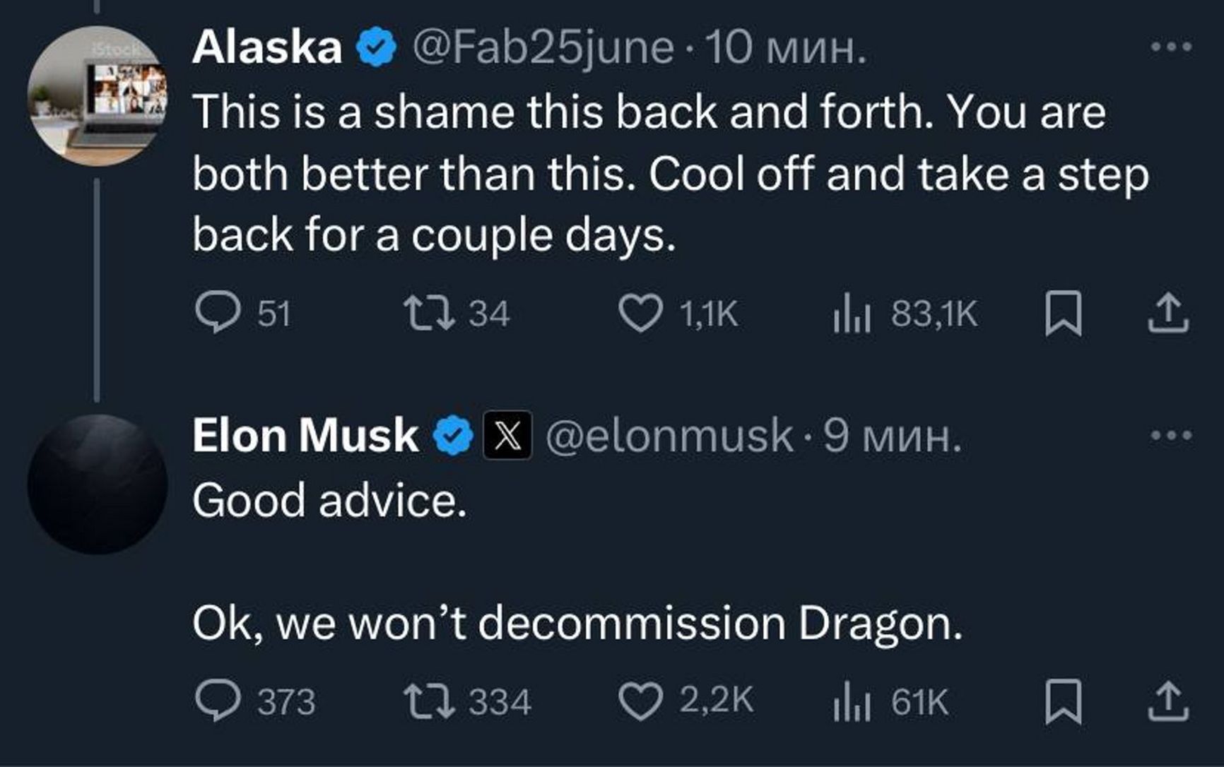 “Good advice. Ok, we won’t decommission Dragon,” Musk responded.