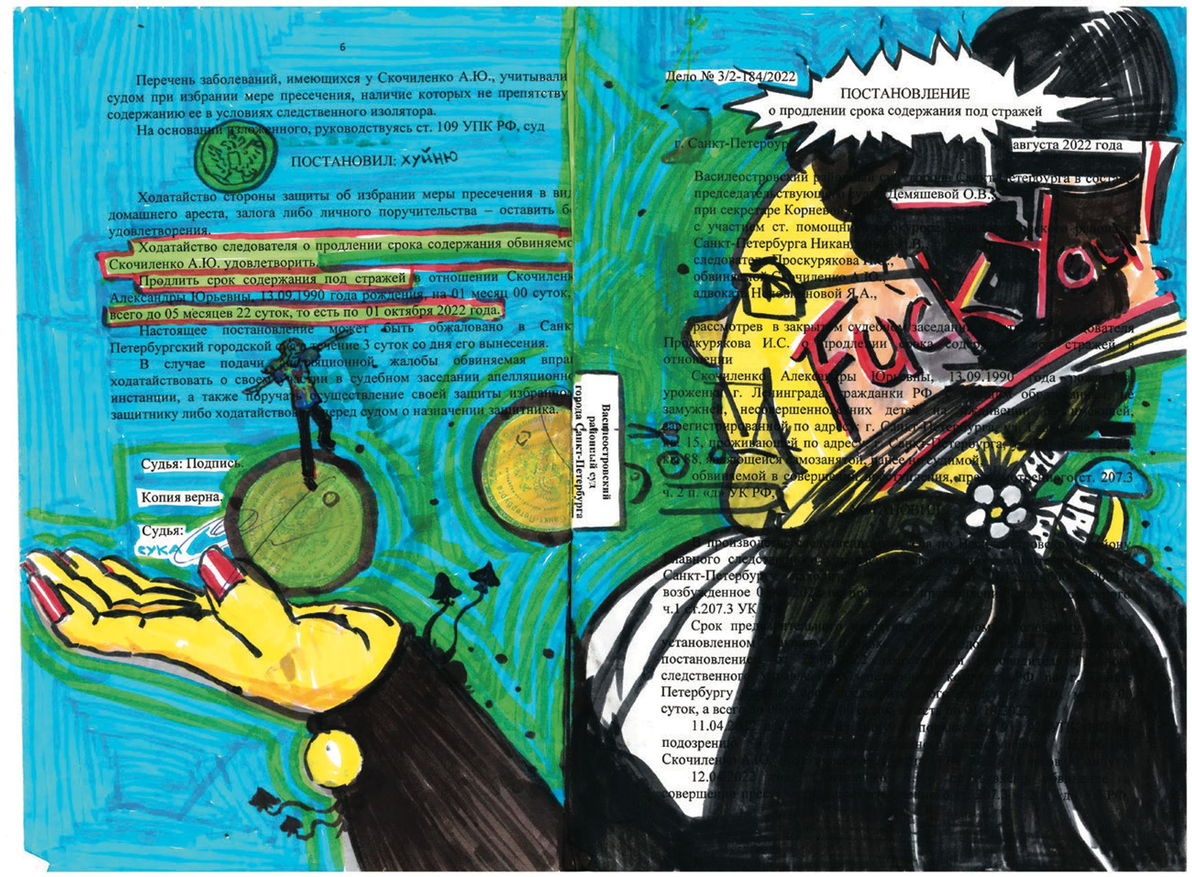 Книга Саши Скочиленко «Мой тюремный трип», выпущенная издательством «Freedom Letters», от первого лица рассказывает о нелепом и жестоком судебном процессе в Санкт-Петербурге, сфабрикованном в самом начале войны. Саша Скочиленко заменила пять ценников в магазинах, поместив на них антивоенные призывы. Хороший знакомый заманил ее в засаду и сдал властям. Дикая атмосфера суда, абсурдность дела, нечеловеческое содержание в СИЗО, и последующее внезапное избавление рассказаны словами поэтессы и художницы, единственными целями которой были и остаются призыв к миру и протест против войны. The Insider публикует фрагменты книги с авторскими иллюстрациями.