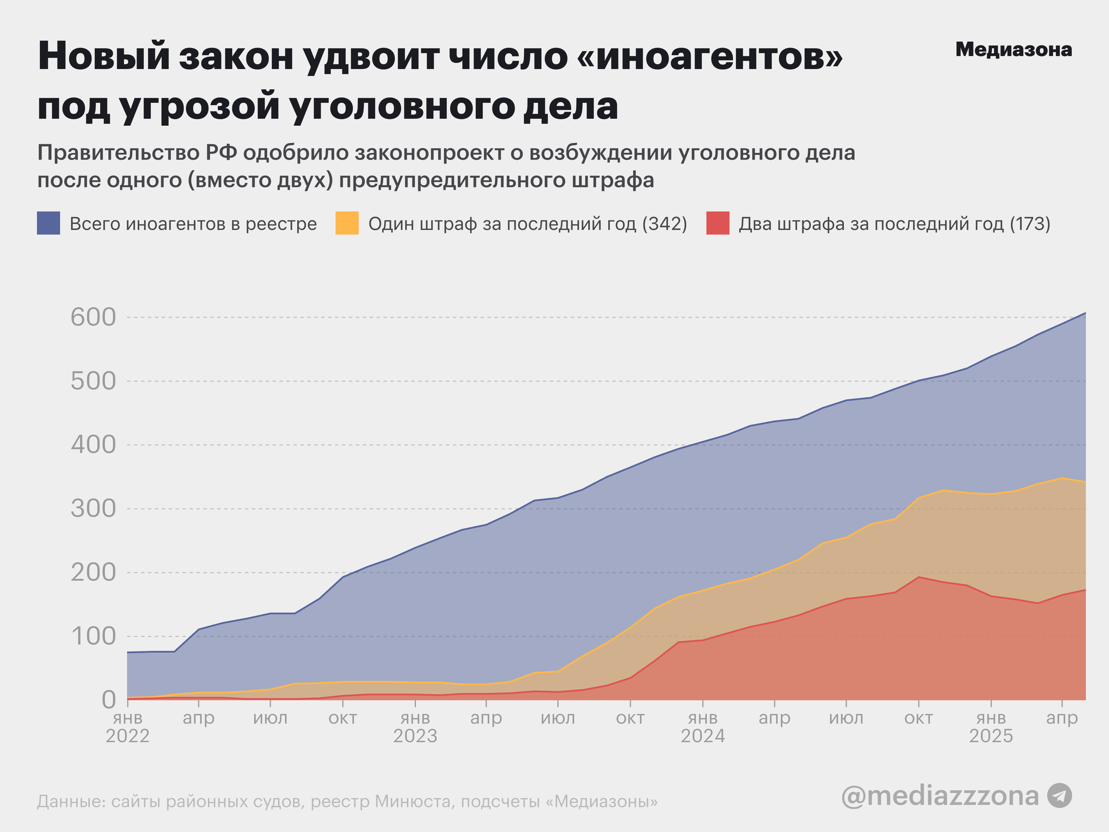 Новые поправки в закон об «иностранных агентах» могут удвоить число уголовных дел. Согласно подсчетам «Медиазоны» по данным на сайтах судов, уже сейчас два «свежих» штрафа есть у каждого третьего «иностранного агента». Одиночных штрафов не старше одного года больше — они есть у 342 «иноагентов».