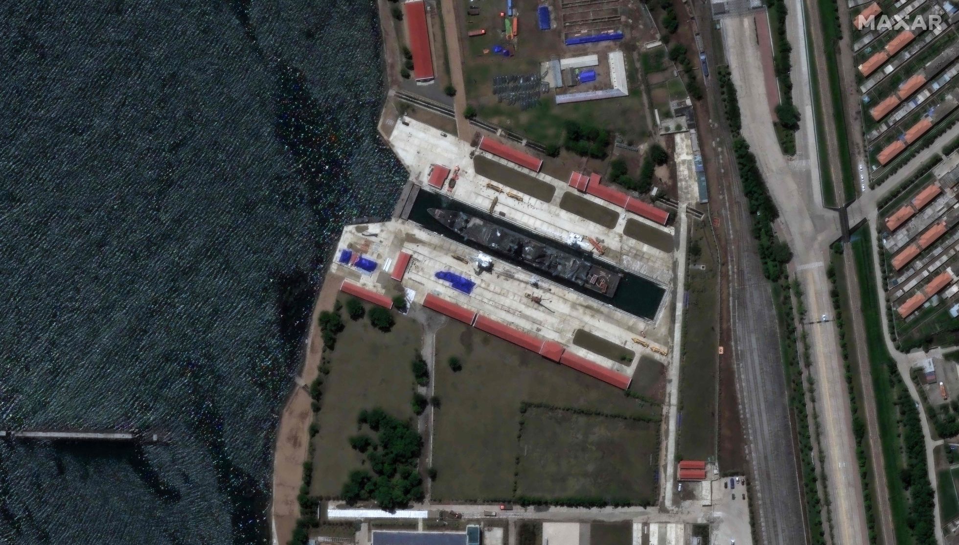 Северокорейский эсминец, получивший повреждения во время спуска на воду в мае, переместили в сухой док в порту Раджин в провинции Хамгён-Пукто, граничащей с Россией, сообщил телеканал CNN, ссылаясь на спутниковые снимки, сделанные 8 июня компанией Maxar Technologies.