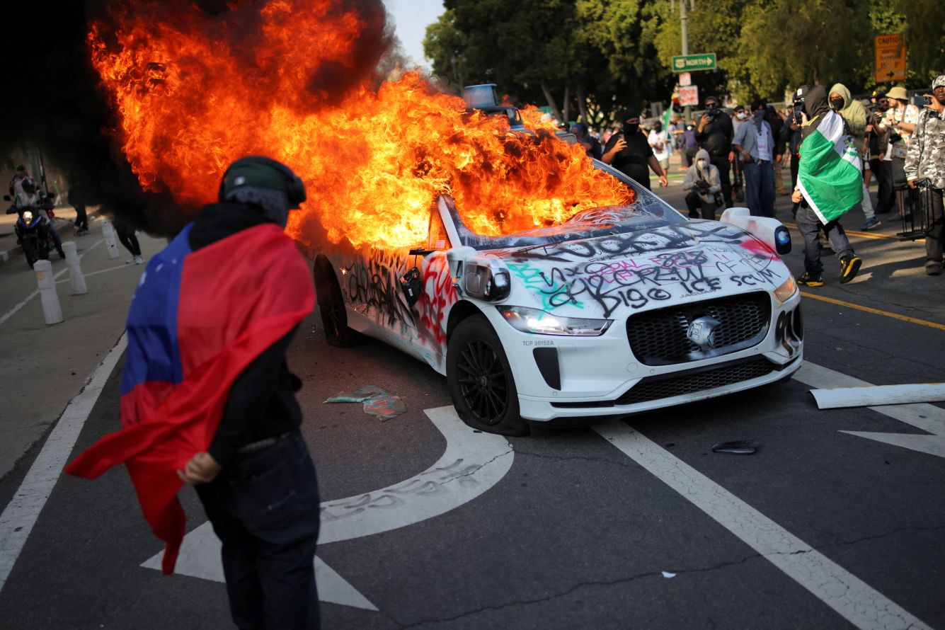 Daniel Cole / Reuters / Scanpix / LETA Протестующий, завернутый в флаг Самоа, на фоне горящей машины в Лос-Анджелесе. 8 июня 2025 года