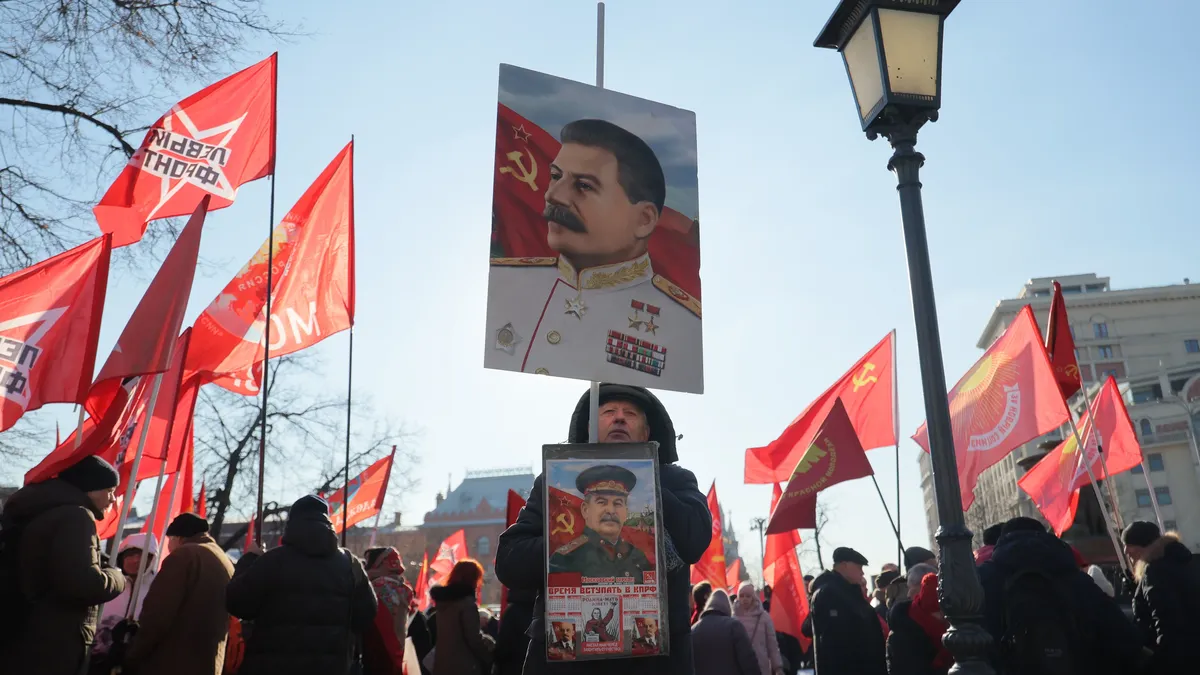 A Communist Party supporter holds portraits of Joseph Stalin during a rally outside the Kremlin in Moscow, Russia, 23 February 2025. Photo: EPA-EFE/MAXIM SHIPENKOV