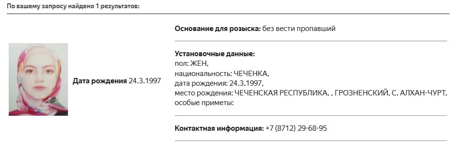 В карточке розыска говорится, что Сулейманову разыскивают как «без вести пропавшую». В качестве контактного телефона указан номер дежурной части отдела МВД Чечни по Наурскому району.