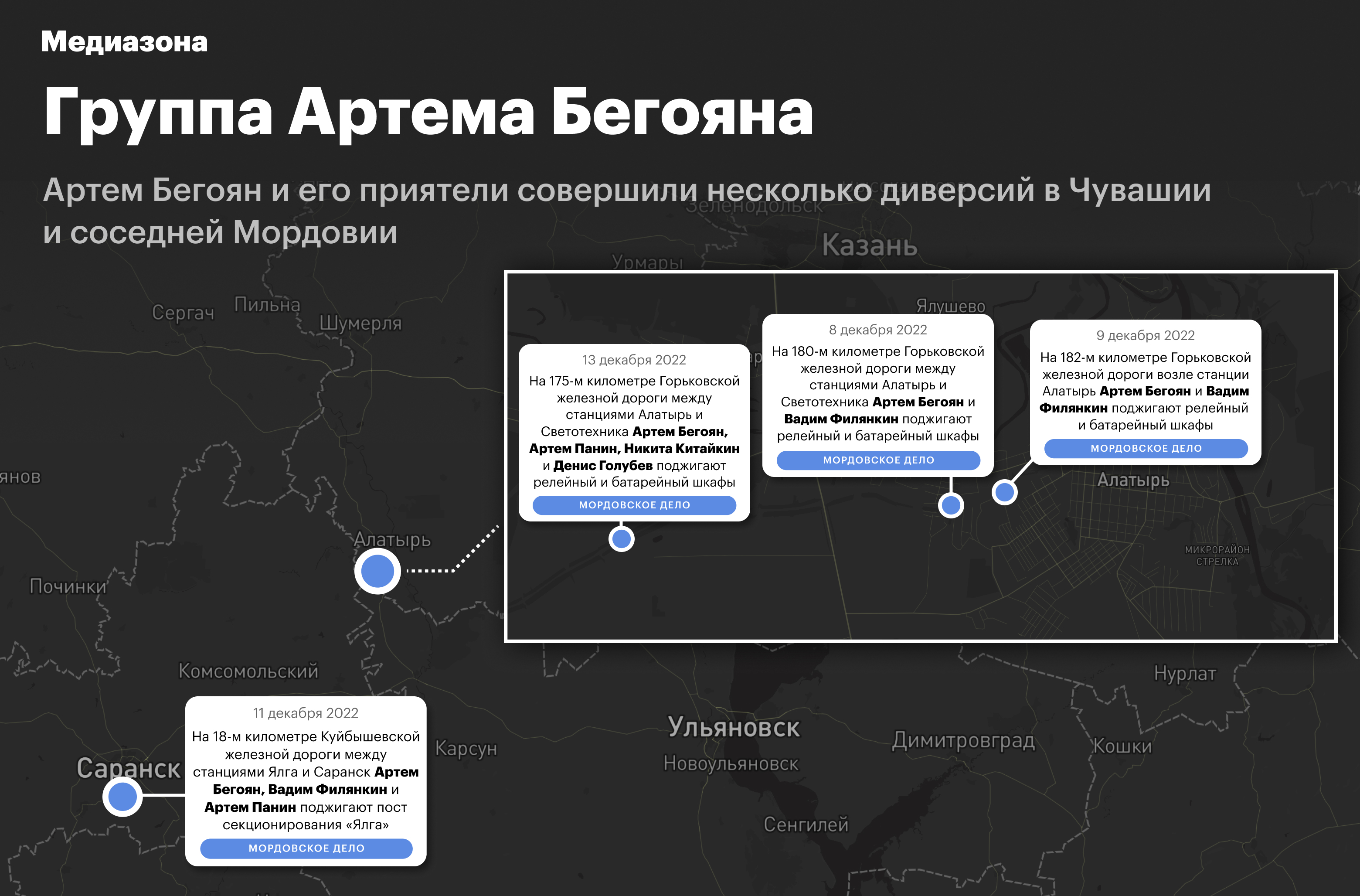 Убедившись в надежности заказчика, Бегоян решился участвовать в поджогах сам и привлек к делу приятелей: 33-летнего Артема Панина, 20-летних Дениса Голубева и Никиту Китайкина и 21-летнего Вадима Филянкина. Они, согласно приговору, успели совершить всего четыре поджога в районе станций Алатырь в Чувашии и Ялга в Мордовии 8, 9, 11 и 13 декабря. В трех случаях они поджигали релейные и батарейные шкафы, в одном — атаковали пост секционирования контактной сети «Ялга».