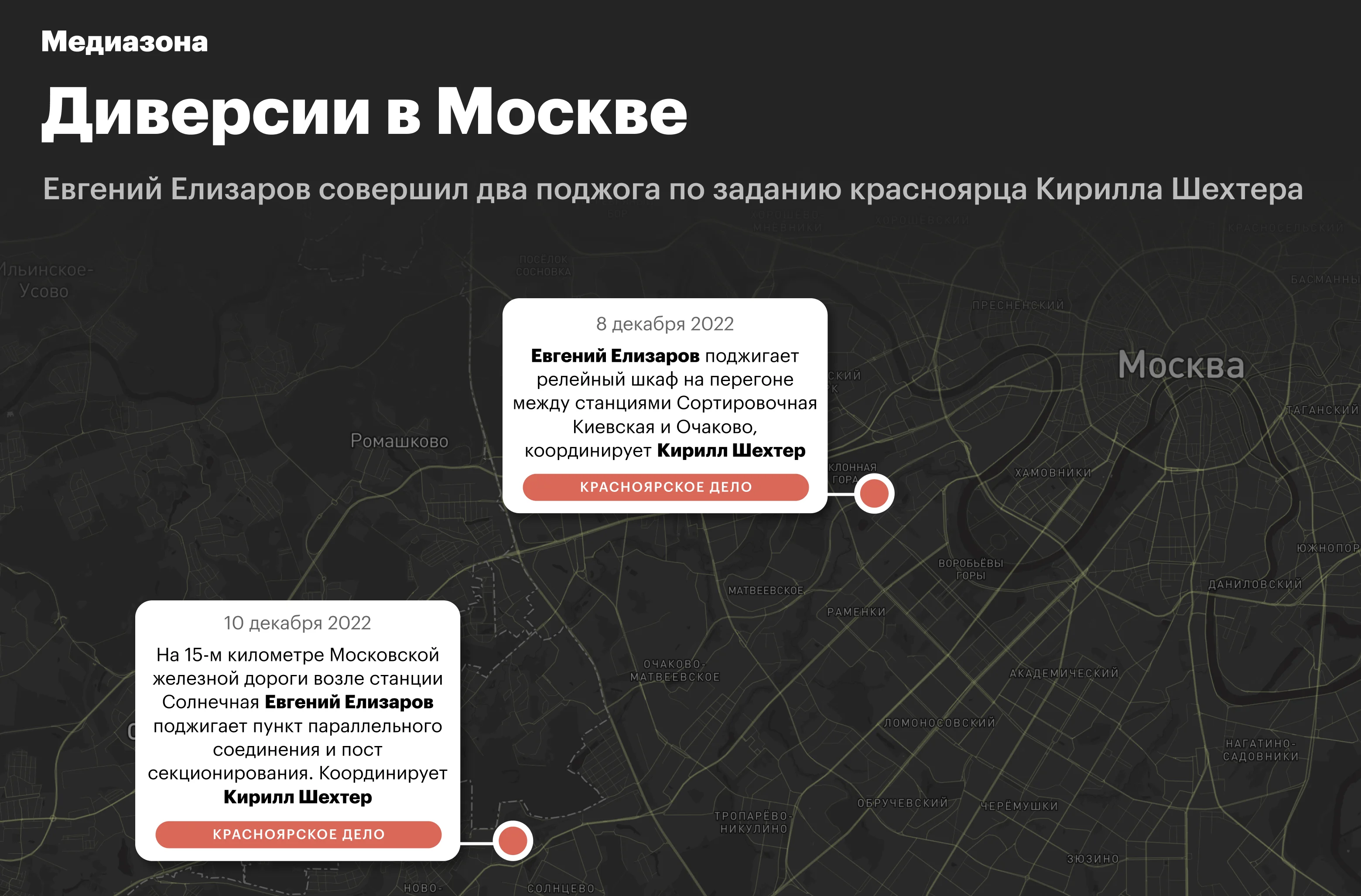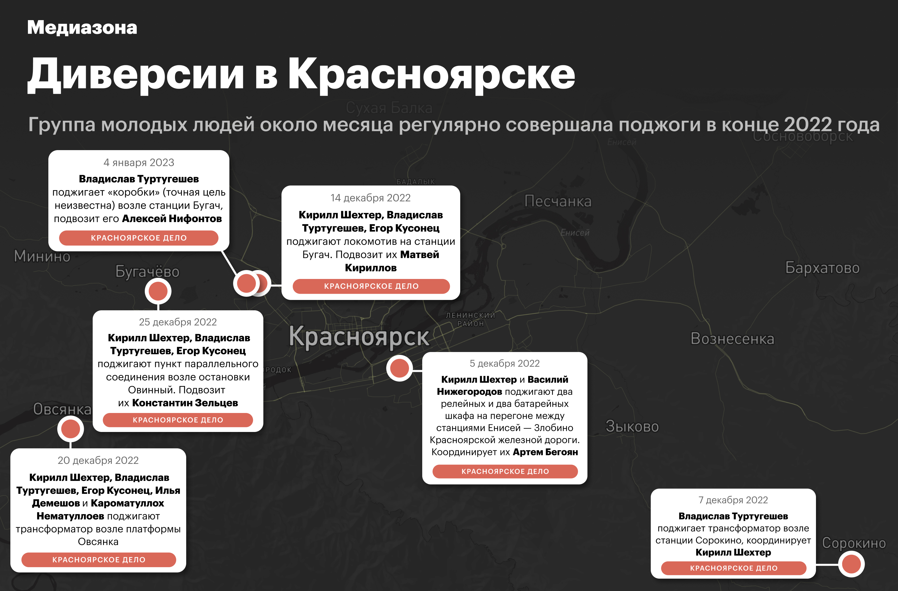 В утекших сводках упоминается несколько эпизодов из красноярского дела. Так, примерно 7 декабря Шехтер поручил поджог 19-летнему работнику мастерской по ремонту часов Туртугешеву. Он согласился. Целью стал трансформатор в районе станции Сорокино, за поджог Шехтер получил 30 тысяч рублей.