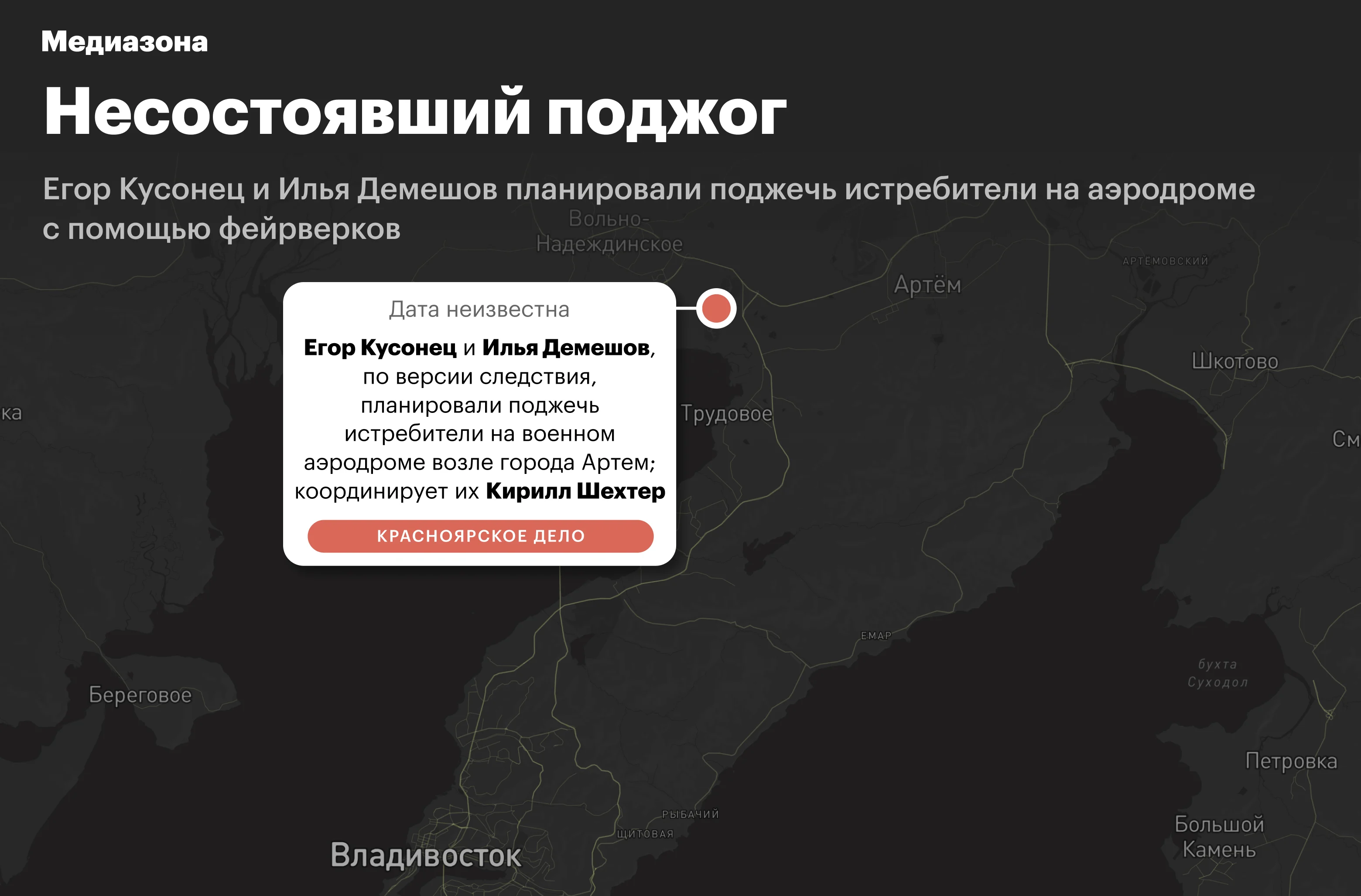 В середине декабря, согласно показаниям свидетеля Портянкина, приятели задумали поджечь истребители, базировавшиеся под Владивостоком. На аэродром в приморском Артеме должны были ехать Кусонец и Демешов. Шехтер проинструктировал их, как сделать взрывчатую смесь. Из-за этого эпизода обвиняемым и вменили покушение на теракт. Портянкин, по его утверждению, слышал, как Кусонец созванивался с «Главным» по громкой связи и интересовался, что делать «в случае их обнаружения сотрудниками полиции и про способы покинуть Россию после совершения преступлений». Этот разговор шел около 10–15 минут.