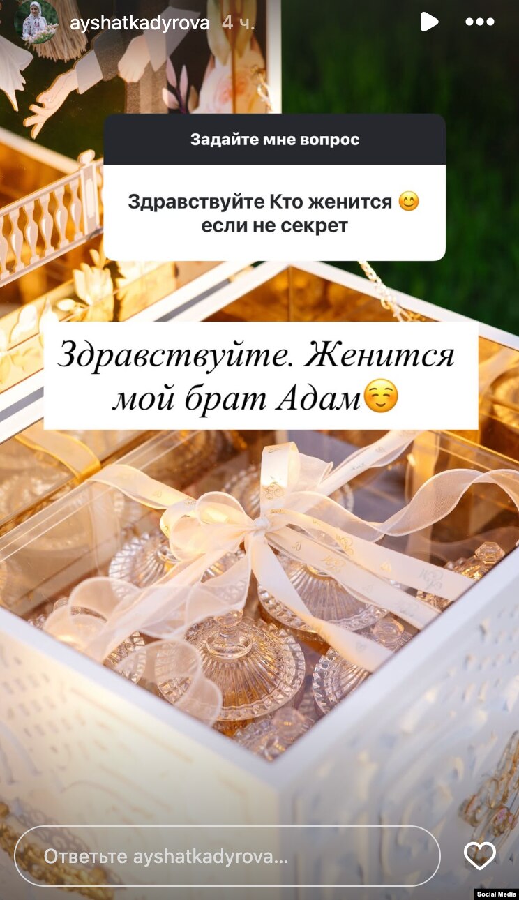 О проведении торжества ранее в своем инстаграме сообщила старшая сестра Адама Айшат Кадырова. По ее словам, невесту зовут Медни, она родом из того же села Ахмат-Юрт, где проживают высокопоставленные кадыровцы.