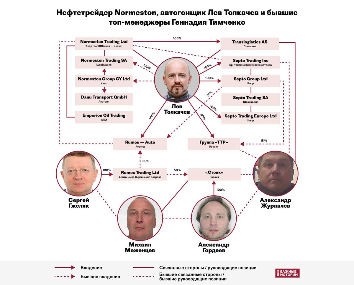 «Важные истории» выяснили, что бывший владелец Normeston с российской стороны — автогонщик Лев Толкачев — одновременно являлся деловым партнером топ-менеджеров Геннадия Тимченко — друга Владимира Путина. До санкций 2014 года Тимченко отвечал за львиную долю российского нефтяного экспорта. Один из его экс-менеджеров, Александр Журавлев, вместе с автогонщиком до сих пор входит в руководство некоторых компаний группы Normeston.