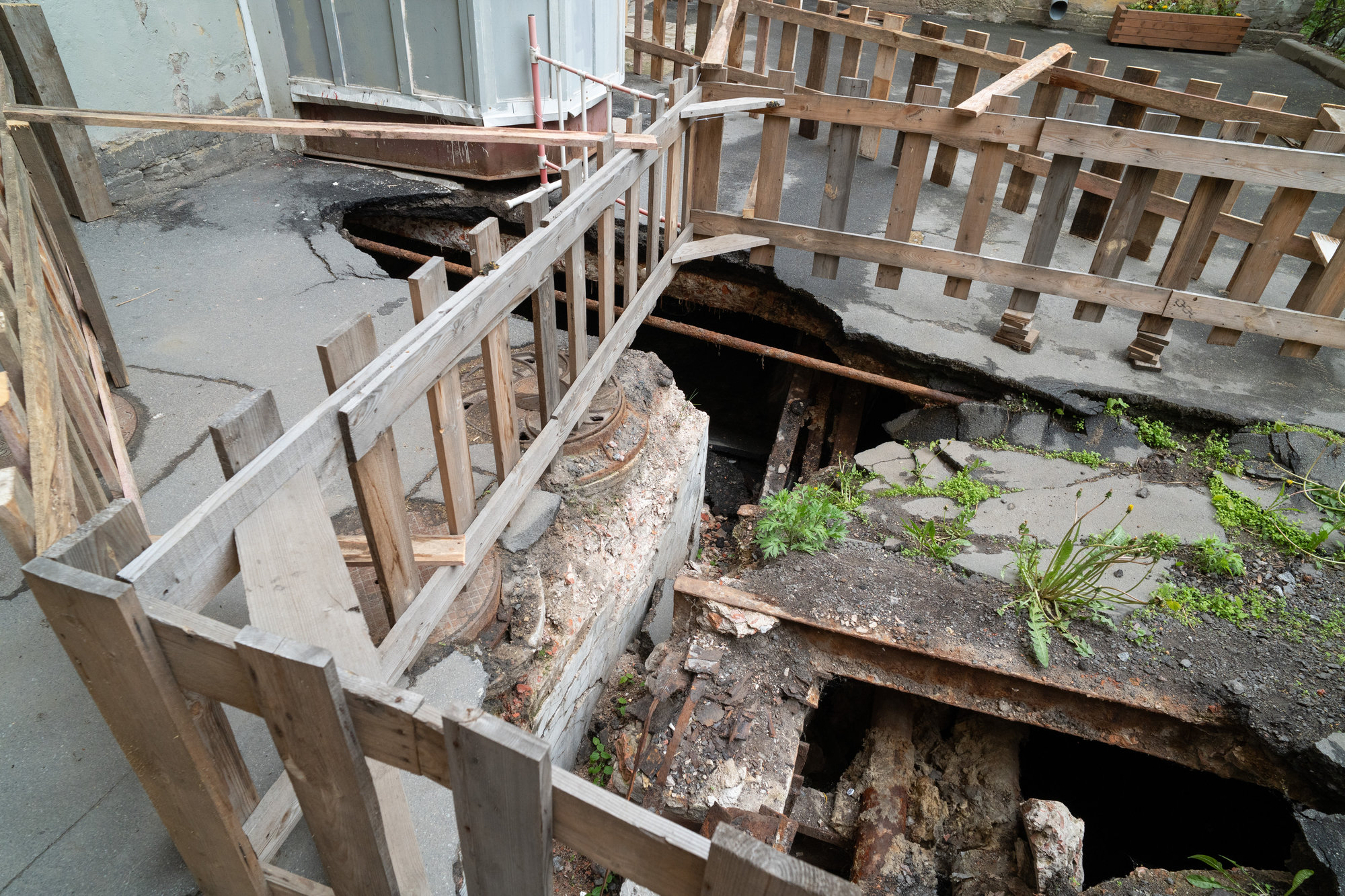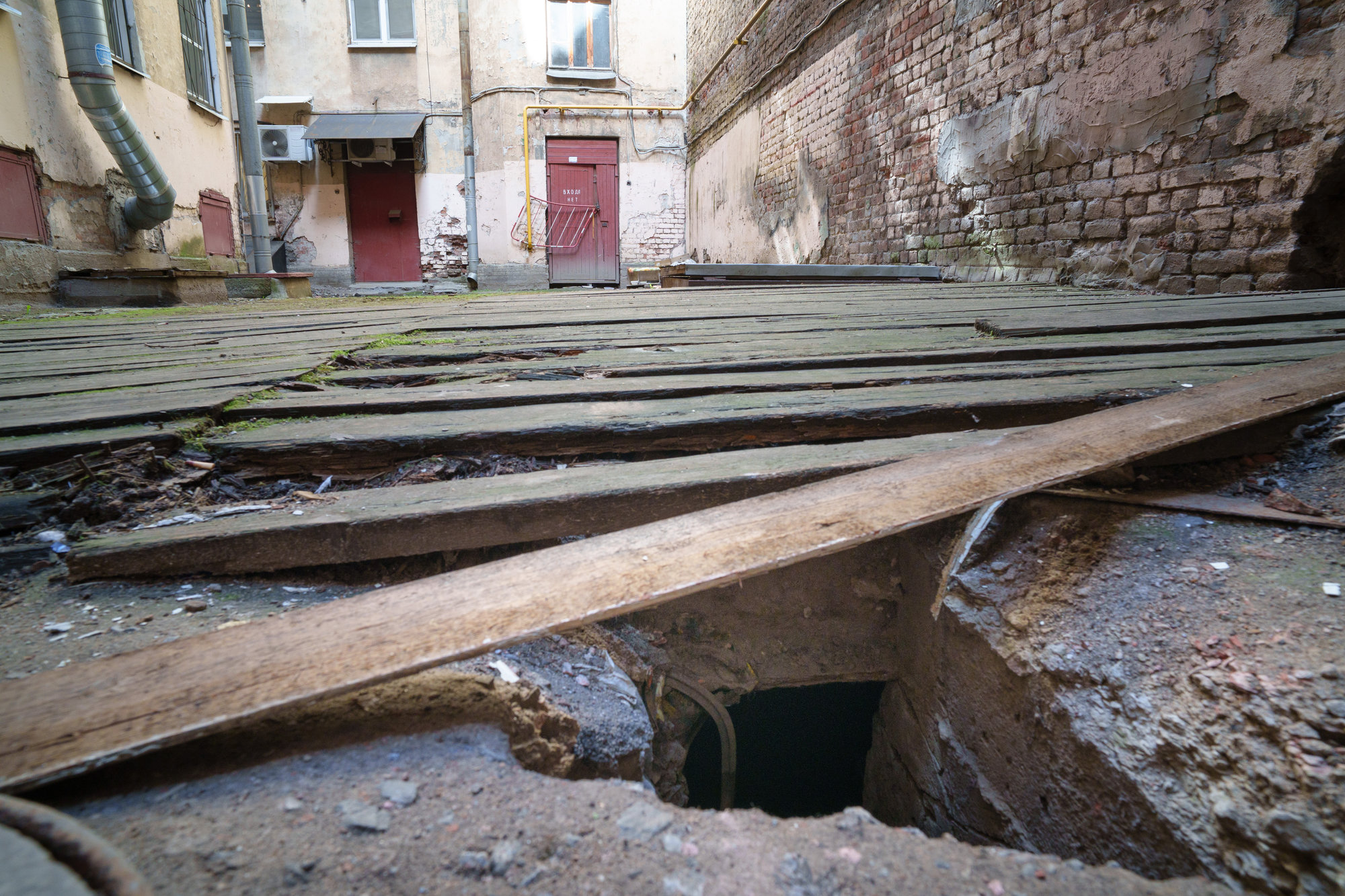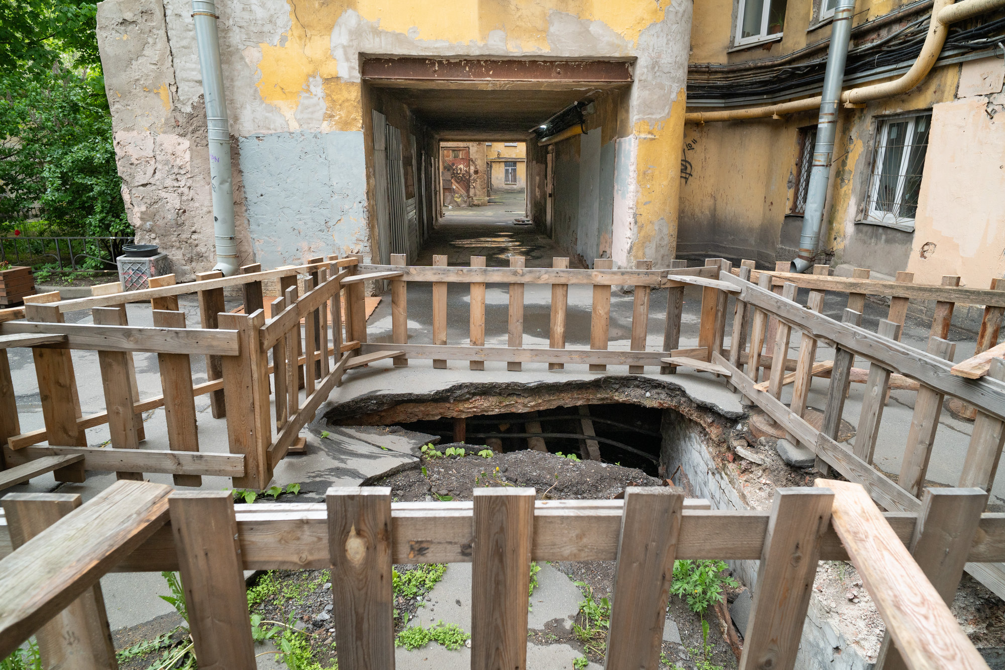Обвал на Боровой начался с появления в 2021 году трещин в покрытии, которые вскоре превратились в яму. Жильцы жаловались на неприятный запах и блох. Вскоре начались разбирательства: кто и за чей счет будет делать ремонт. Оказалось, главная проблема — у подвесных дворов нет хозяина, не определено, кто должен следить за их состоянием и содержать их.