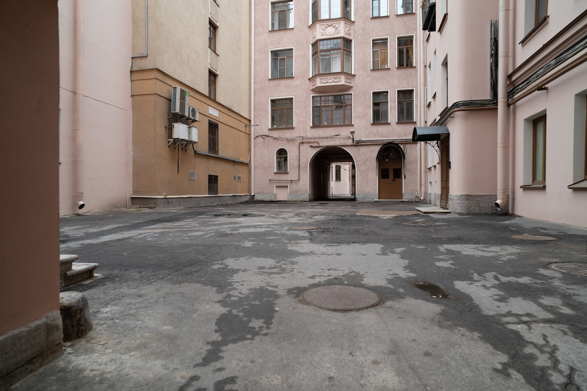 Зайти в такой двор — например, в доме Бажанова на Марата, 72 — можно через дверь на черной лестнице. До революции в подземных помещениях двора дома Бажанова располагались комнаты хранения вещей, прачечная, склад дров, угольные бункеры и котельная.