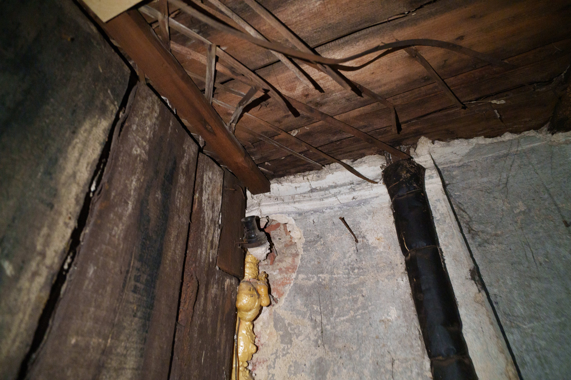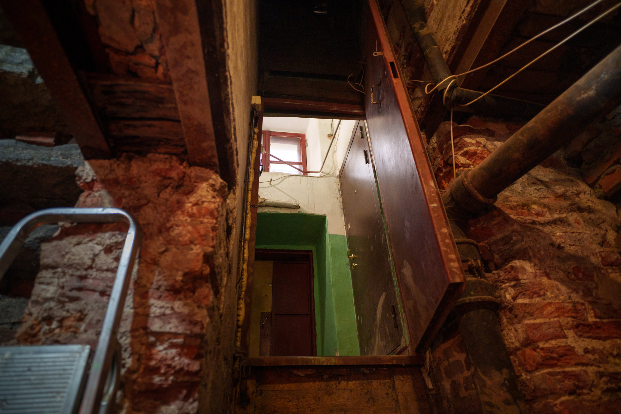 В бывшем подвесном дворе живет градозащитник Олег Мухин — он узнал про то, что здесь в советские годы были обрушения, от своего соседа. «Здесь по центру был провал, а по бокам были набросаны доски, по которым все ходили», — говорит Мухин. Сейчас большая часть двора засыпана, но арочные своды и старые, заржавевшие перекрытия — они еле выдерживают квартиру сверху — до сих пор можно найти в подвальных помещениях.