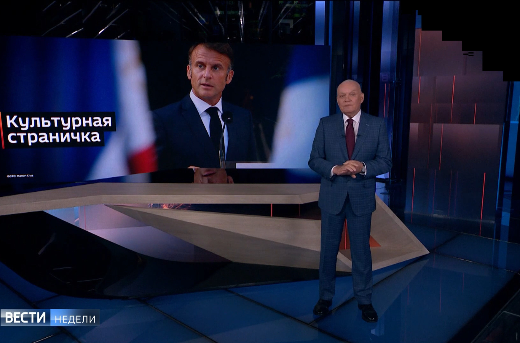 The Insider15 July 2025Очередную «Культурную страничку» в «Вестях недели» Дмитрий Киселев посвятил Эммануэлю Макрону, приписав ему нарциссизм и попытки представить себя новым Наполеоном. Один из эпизодов, привлекших внимание пропагандиста, — государственный визит Макрона в Великобританию: