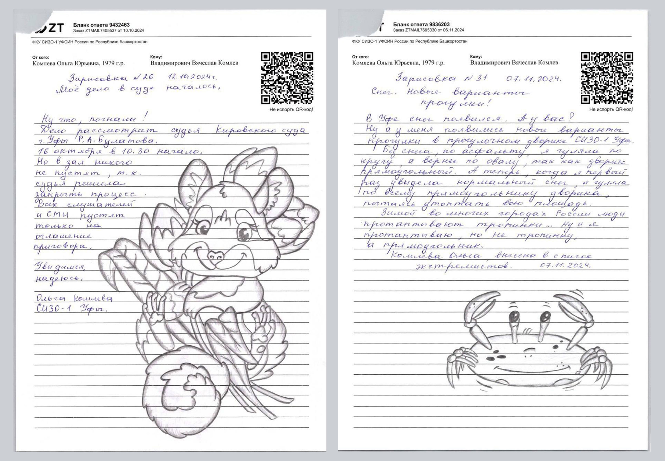 28 марта Кировский районный суд Уфы отправил Ольгу в СИЗО. «Новая летопись моей жизни началась. Но вы же меня знаете! Я, хоть и мило выгляжу, но не лыком шита. Продолжение следует», — написала она в первом письме из изолятора.