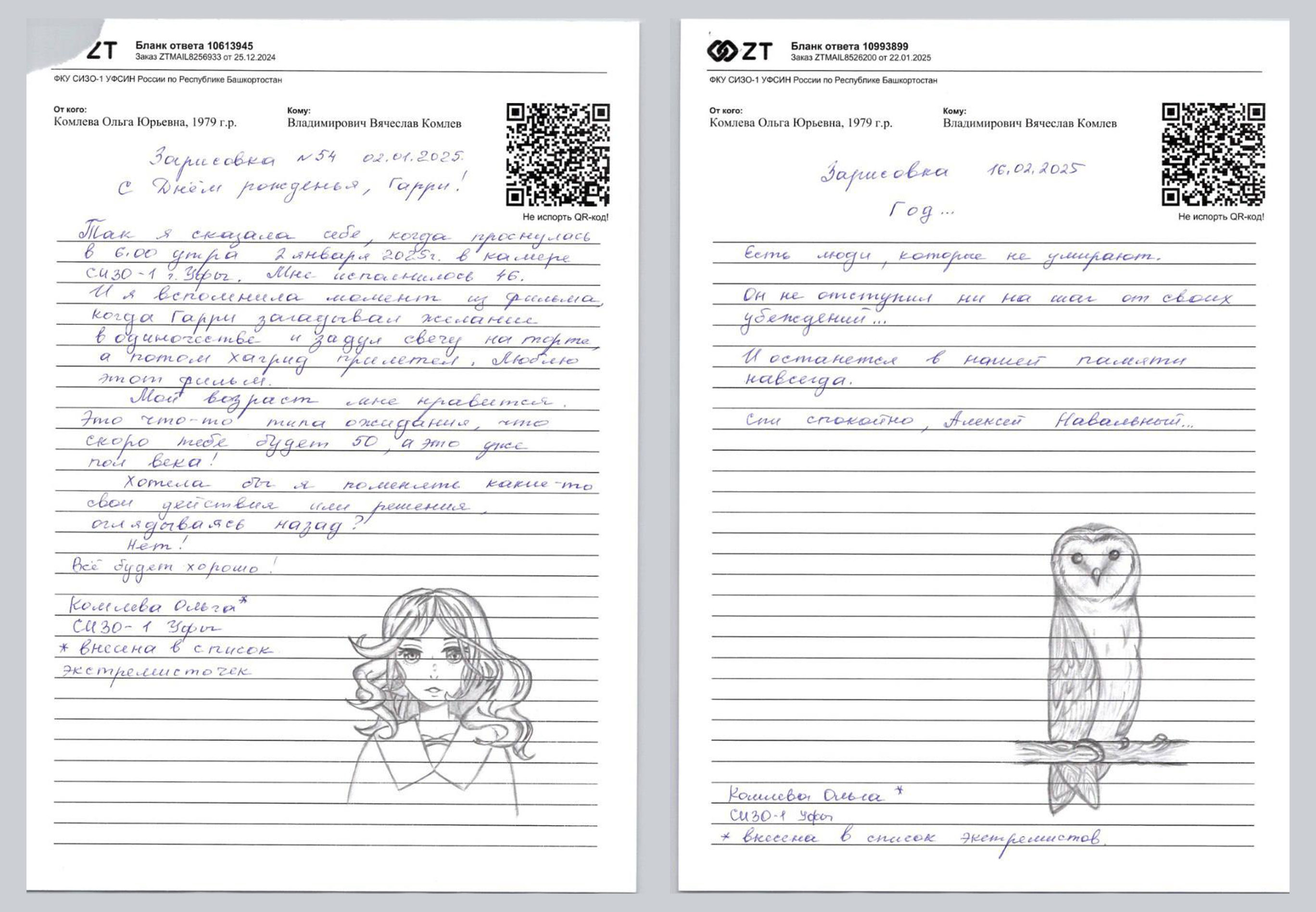 Вячеслав Комлев говорит, что его жене пишут очень много писем. Но, кроме этих писем и коротких свиданий с родными, в жизни Ольги общения почти нет: с момента, как ее перевели из СИЗО Москвы обратно в Уфу, она содержится в одиночной камере.