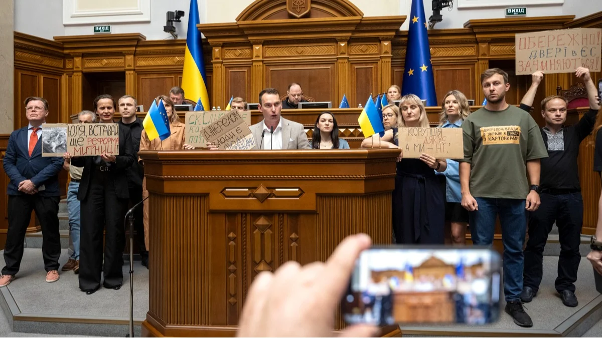 Украинские депутаты держат плакаты во время сессии парламента, посвященной восстановлению независимости антикоррупционных органов, Киев, Украина, 31 июля 2025 года. Фото: Andrii Nesterenko / EPA