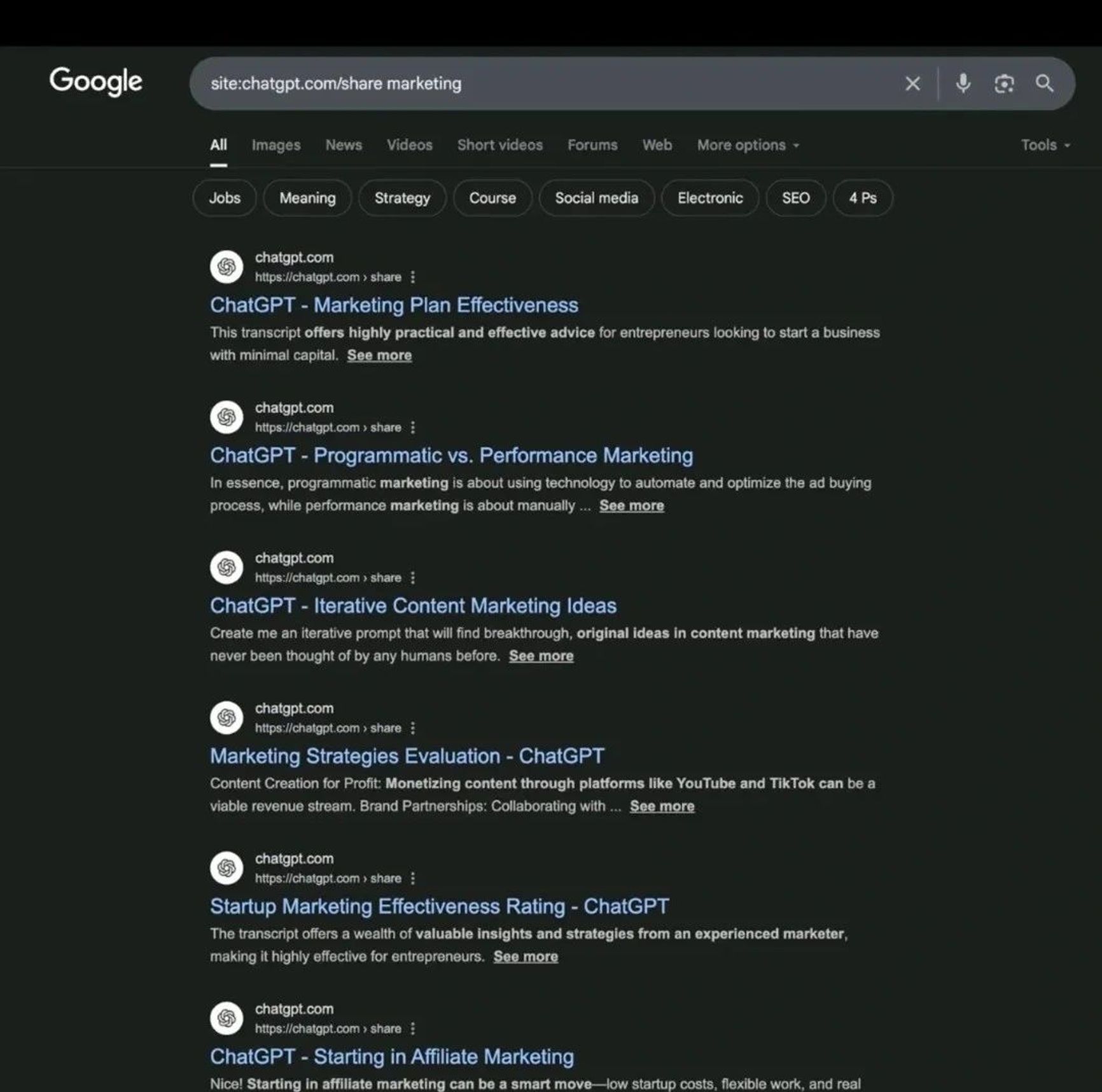 Скриншот: проиндексированные переписки пользователей ChatGPT, в которых упоминалось слово marketing