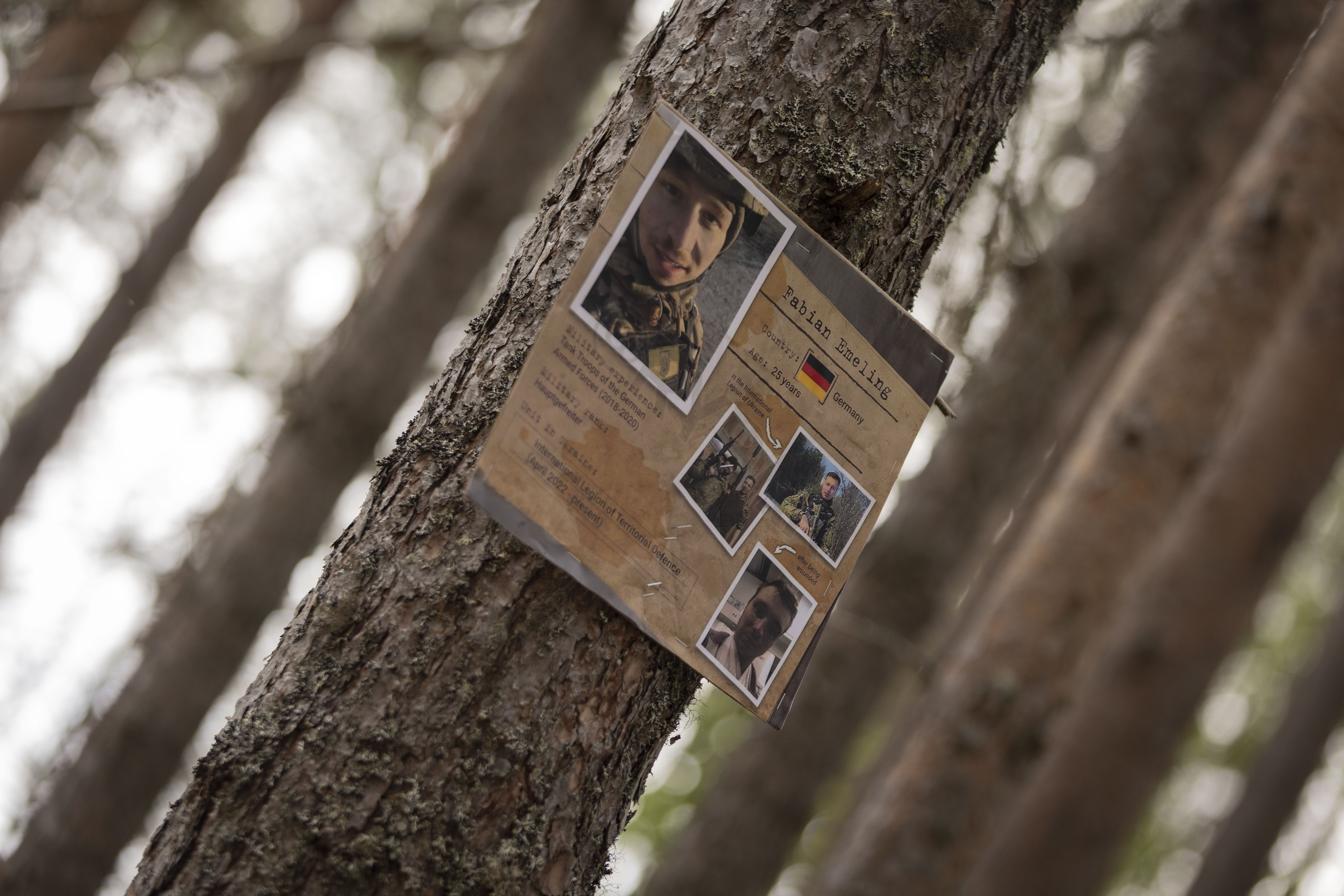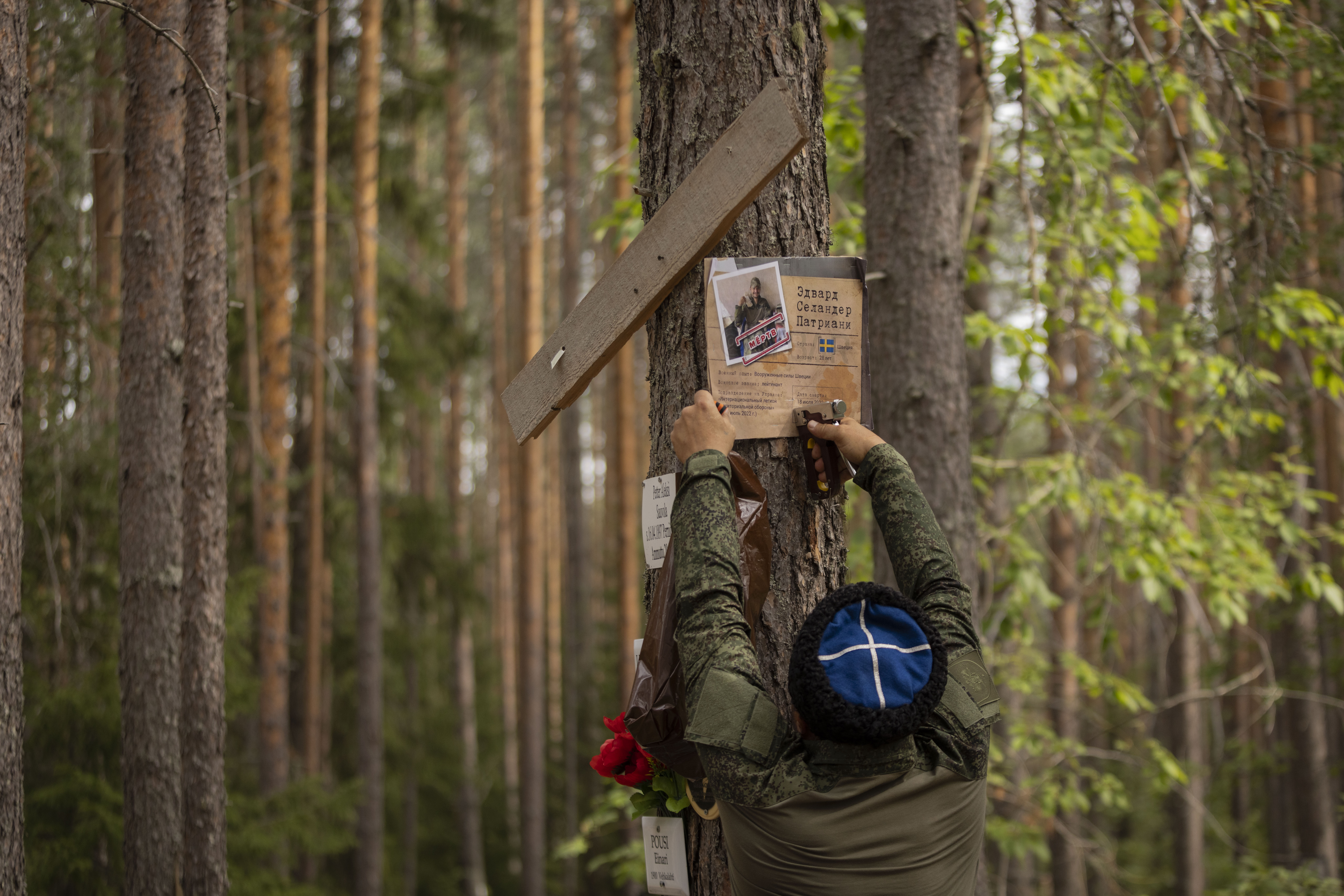 This year, a few hours before the start of the event, four strangers in civilian clothes appeared in the forest, followed by two more in camouflage and Cossack hats, or papakhas. Eyewitnesses noticed that these men were communicating with each other over a radio. They also nailed provocative plaques to trees with photos and brief biographies of a Finn, a German, a Pole, and a Swede who allegedly fought for Ukraine after Russia’s 2022 full-scale invasion.