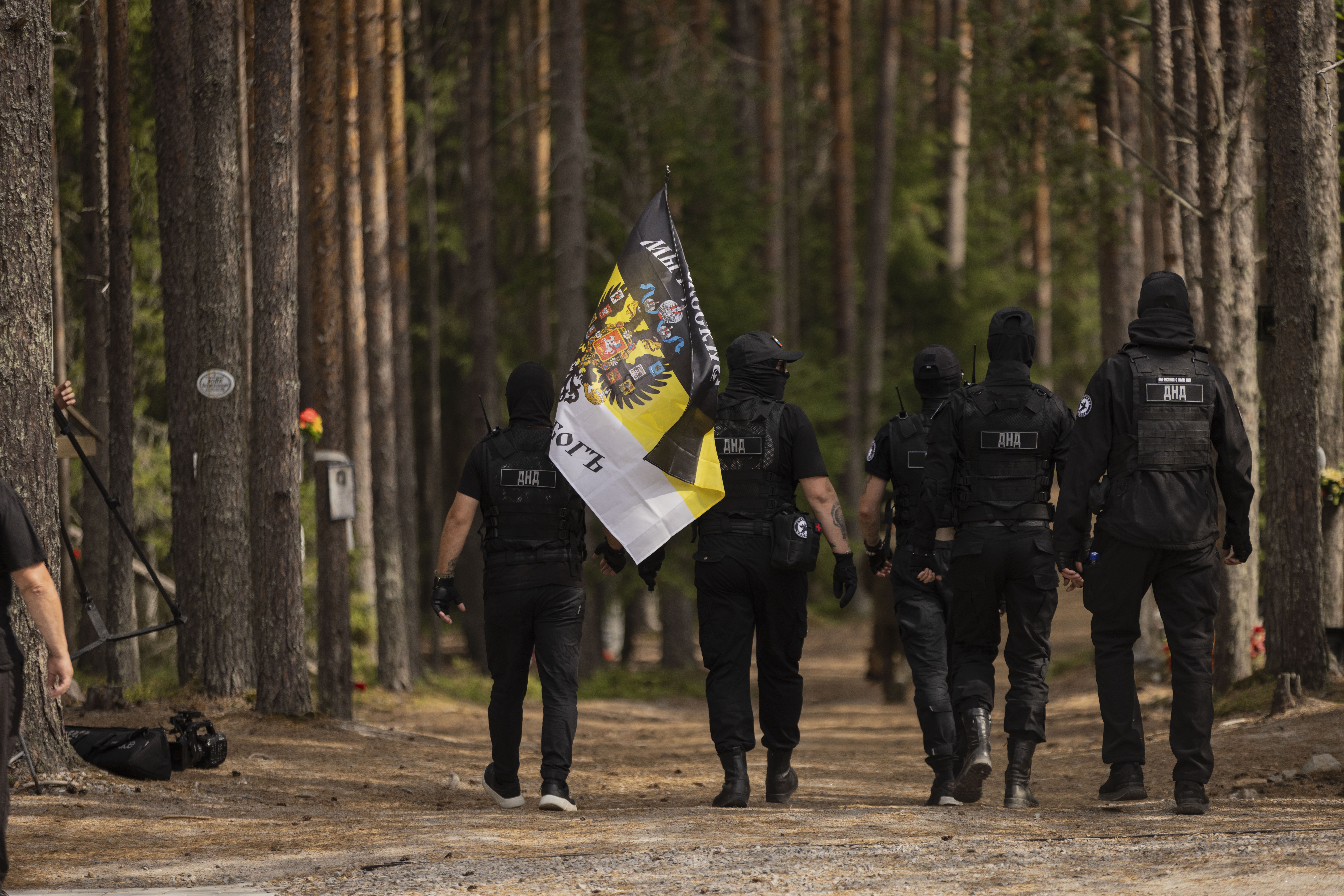By this time, the camouflage-clad crowd and members of the Young Guard had been joined by representatives of the “Russian Community” of Karelia, a far-right vigilante group, along with a group in black uniforms and balaclavas who called themselves the People’s Volunteer Druzhina (Squad). The nationalists walked through the forest with an imperial Russian flag.