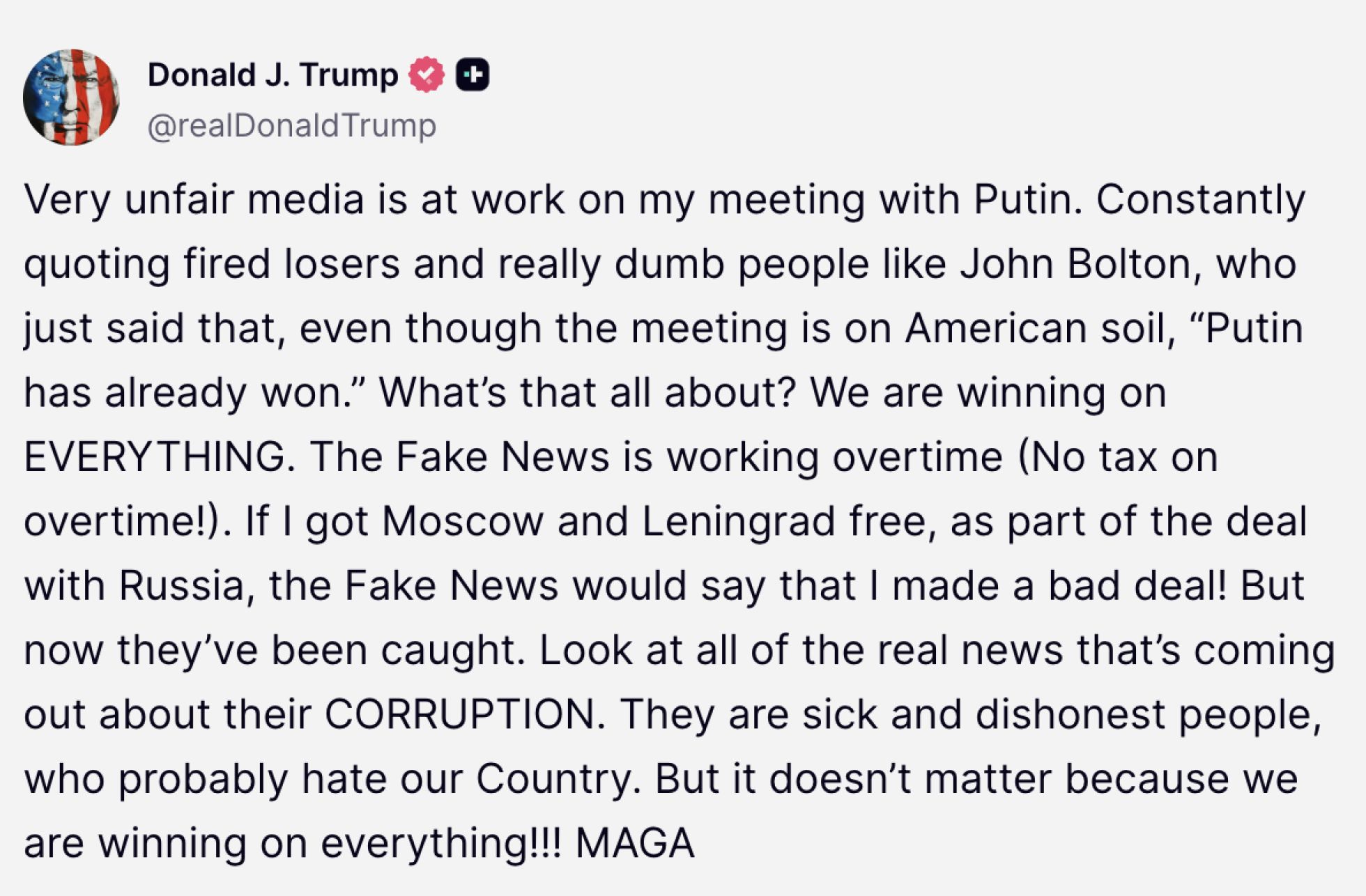 Многие вспоминают встречу Трампа и Путина в 2018 году в Хельсинки. Согласно почти единодушной оценке и экспертов, и политиков, и журналистов, тогда Трамп провалил переговоры: не добился ни одной уступки, не поднял ни одной значимой темы и вообще чуть ли не заискивал перед Путиным. Тогдашняя советница Трампа по России Фиона Хилл потом рассказывала, что во время совместной пресс-конференции президентов по итогам саммита подумывала даже симулировать припадок, чтобы ее прервать — настолько ее ужасало то, что говорил ее начальник.