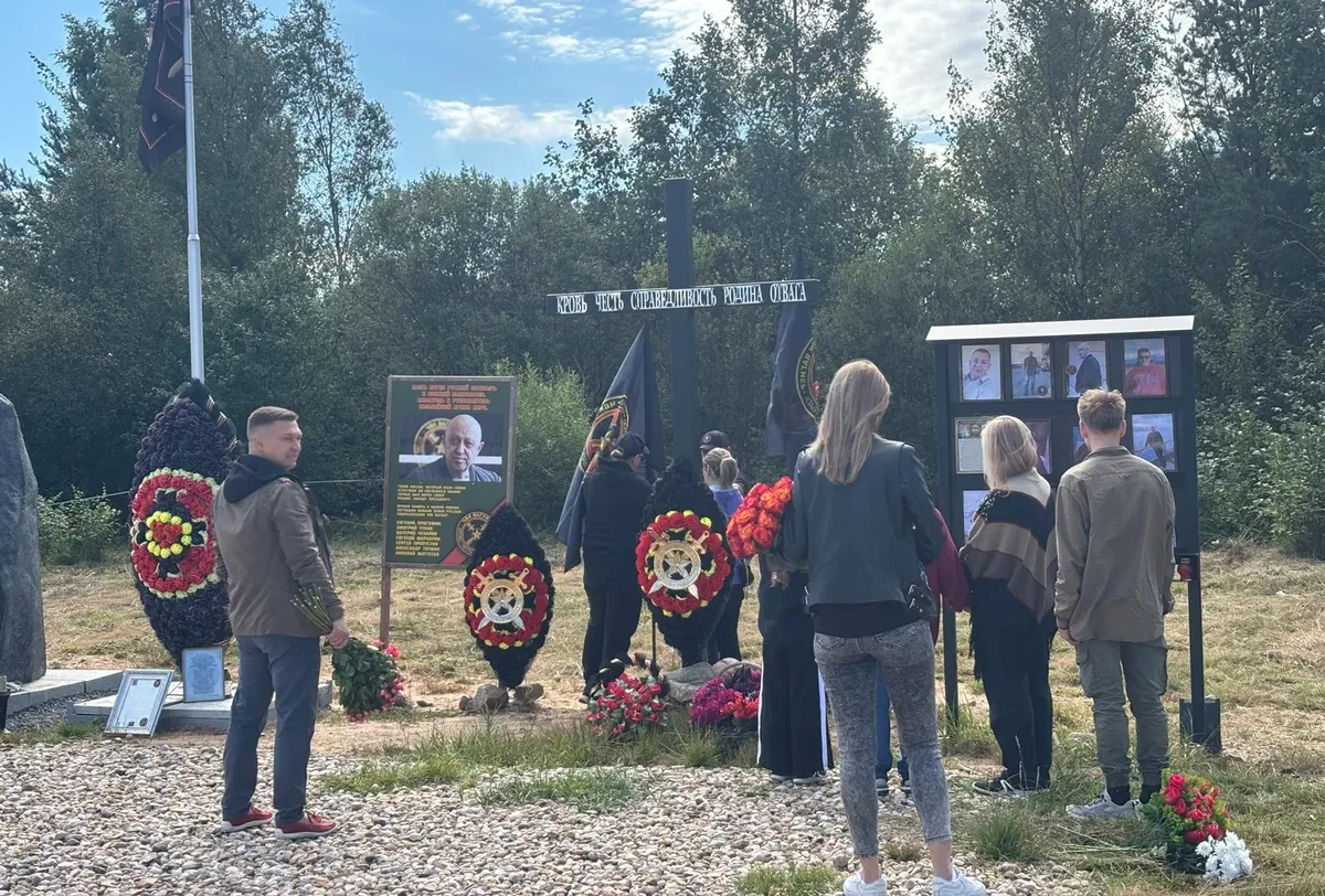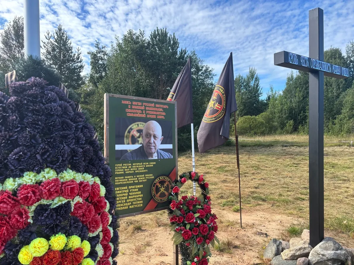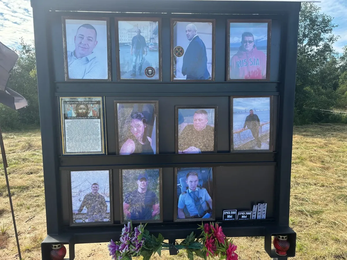 Портреты всех погибших установлены на стенде рядом с флагами и ритуальным крестом, на который присверлены металлические буквы — слоган «Вагнера»: «Кровь. Честь. Справедливость. Родина. Отвага». Но портрет Пригожина стоит еще и отдельно — с патетичной надписью: «Здесь погиб русский богатырь и великий полководец, создатель и руководитель сильнейшей армии мира». А ниже — заверения в верности стране и президенту.