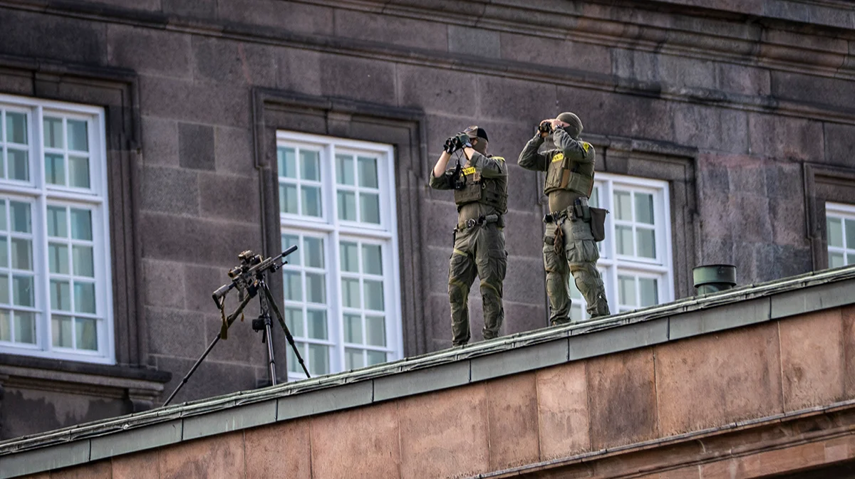 Сотрудники спецподразделения датской полиции стоят на крыше и наблюдают за территорией вокруг замка Кристиансборг в Копенгагене, Дания, 1 октября 2025 года. Фото: Emil Nicolai / EPA