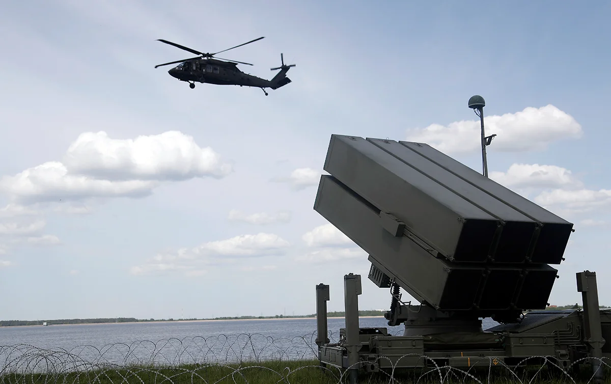 Вертолет Black Hawk армии США и испанский зенитно-ракетный комплекс (NASAMS) на учениях «Латвийский щит 25» на Рижской гидроэлектростанции в Доле, Латвия, 28 мая 2025 года. Фото: Toms Kalnins / EPA