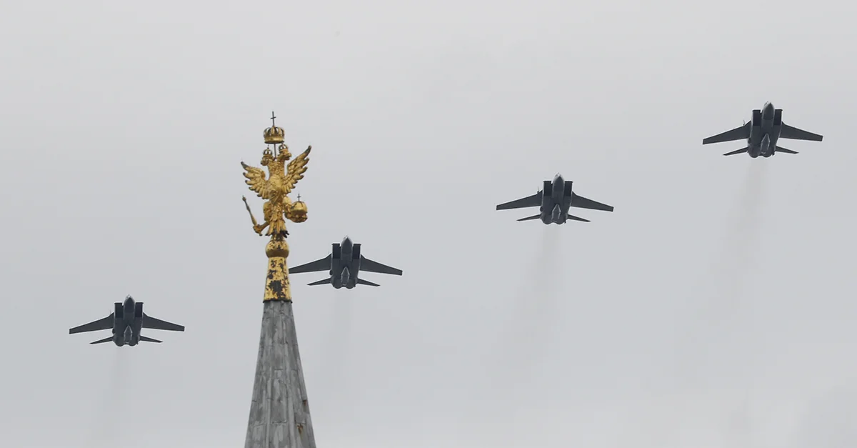 Российские истребители Миг-31 выступают над Красной площадью во время воздушного парада в честь Дня Победы над Красной площадью в Москве, Россия, 9 мая 2020 года. Фото: Сергей Чириков / EPA