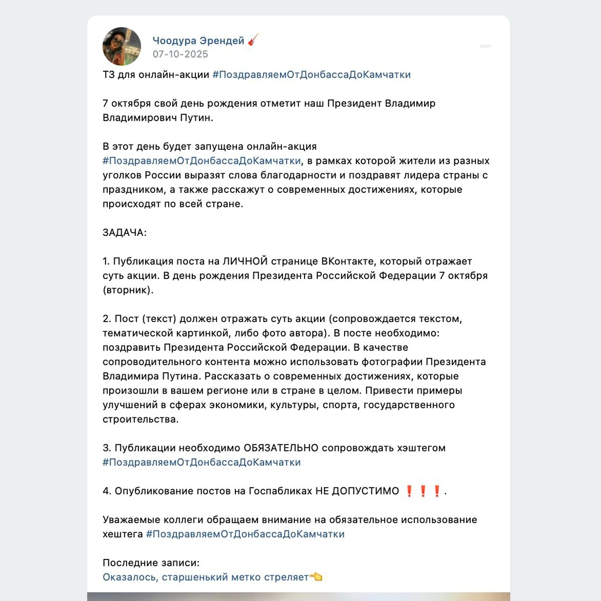 «Пост (текст) должен отражать суть акции (сопровождается текстом, тематической картинкой, либо фото автора). В посте необходимо: поздравить Президента Российской Федерации. В качестве сопроводительного контента можно использовать фотографии Президента Владимира Путина. Рассказать о современных достижениях, которые произошли в вашем регионе или в стране в целом. Привести примеры улучшений в сферах экономики, культуры, спорта, государственного строительства», — говорилось в ТЗ.