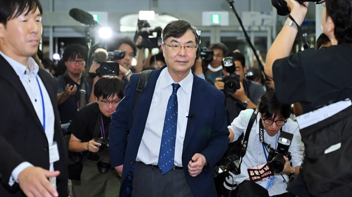 Профессор Осакского университета Шимон Сакагучи (в центре) прибывает на пресс-конференцию в городе Суита, Осака, Япония, 6 октября 2025 года. Фото: Jiji Press / EPA
