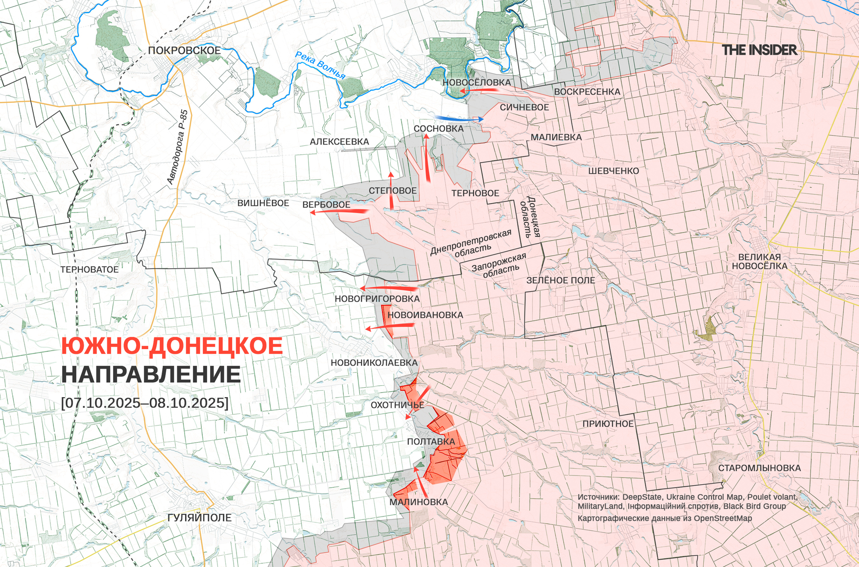 DeepState фиксирует продвижение ВС РФ в районе Новониколаевки, Новоивановки, Охотничьего, Малиновки, Вишневого и в Полтавке. Кроме того, в проекте показывают кадры с российскими бойцами, геолоцированные в Алексеевке к северу от Вербового, и утверждают, что штурмовая группа пробралась в село под покровом тумана, причем трое из них уже убиты. Наконец, в DeepState демонстрируют сентябрьские кадры зачистки Сичневого (до 2024 года — Январское) от 141-й ОМБр и отмечают, что в это село, как и в Новосёловку, снова проникают российские бойцы.