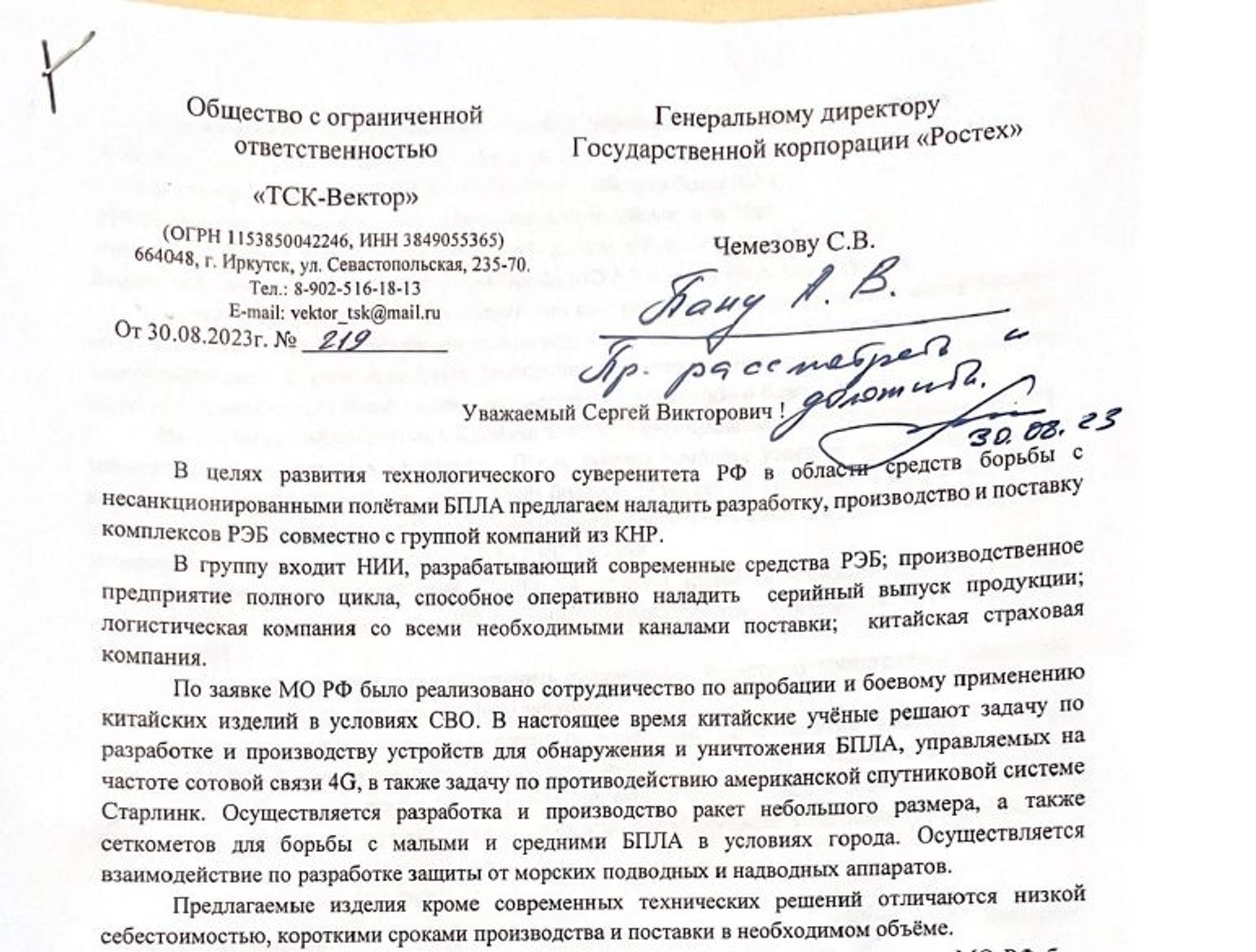 Most notably, a document addressed to Rostec CEO Sergei Chemezov includes a proposal to establish contacts with “a group of companies from the People’s Republic of China” for the development, production, and supply of electronic warfare (EW) systems.