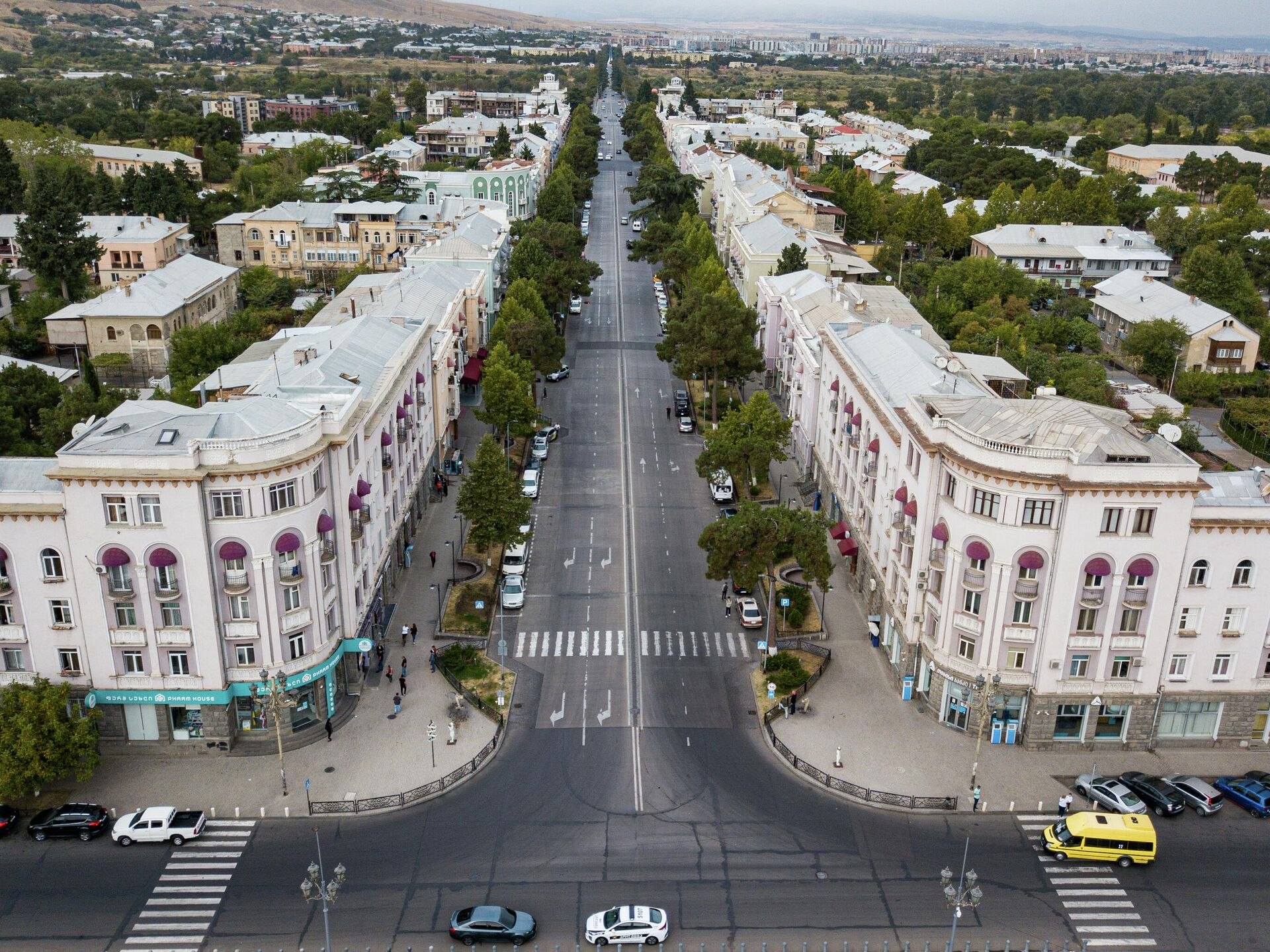 Стоит пересечь мост через Мтквари — обратите внимание на фигурные перила и фонари на парапете, — как вы окажетесь буквально «у ворот» Старого Рустави. По обеим сторонам центрального проспекта Мераба Костава стоят две парные «сталинки» — они отмечают парадный въезд в город. Тут же можно посмотреть на странное сооружение из металлоконструкций — относительно современный объект «Пирамида».